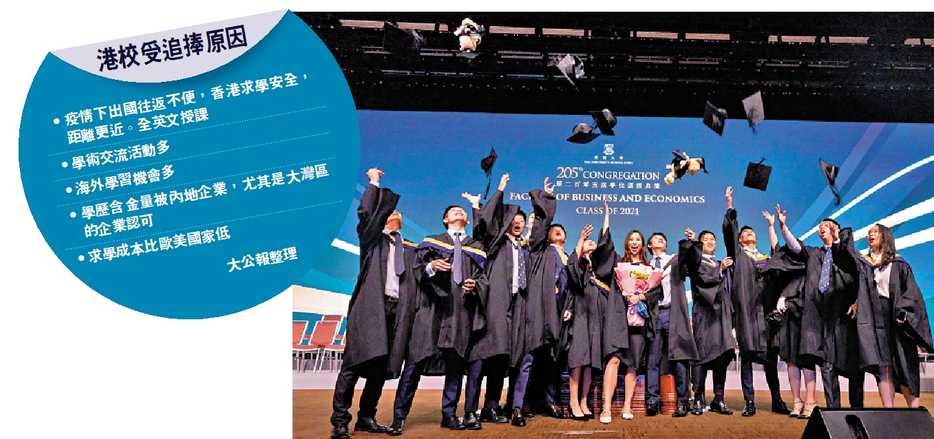有深圳家長向大公報表示,孩子從小在國際學校就讀,原本計劃赴歐美留學,但近年來,國際形勢複雜多變,且受疫情影響,出國往返都十分不方便,相比之下,香港國安法實施以後,香港社會重歸平靜,求學安全無虞,距離也更近。「香港高校全部英文授課。海外學習機會多,學歷的含金量也就被內地企業,尤其是大灣區的企業認可,但求學成本又比歐美國家的留學費用低。」