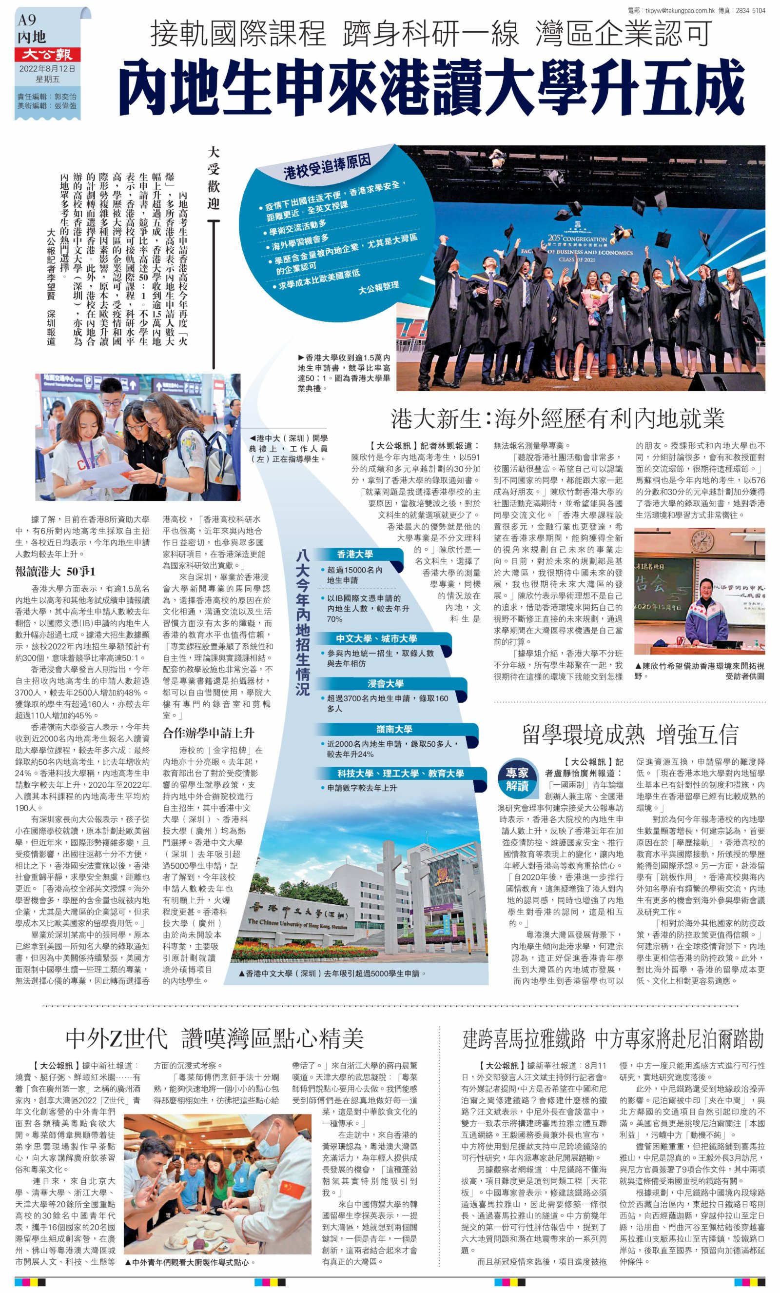(大公報記者 李望賢、林凱、盧靜怡)內地高考生申請香港高校今年再度「火爆」,多所香港高校表示內地生申請人數大幅上升超過五成,香港大學收到逾1.5萬內地生申請書,競爭比率高達50:1。不少學生表示,香港高校可接軌國際課程,科研水平高,學歷被大灣區的企業認可,受疫情和國際形勢複雜多種因素影響,原本去歐美升讀的計劃轉而選擇香港。此外,港校在內地合辦的高校如香港中文大學(深圳),亦成為內地眾多考生的熱門選擇。