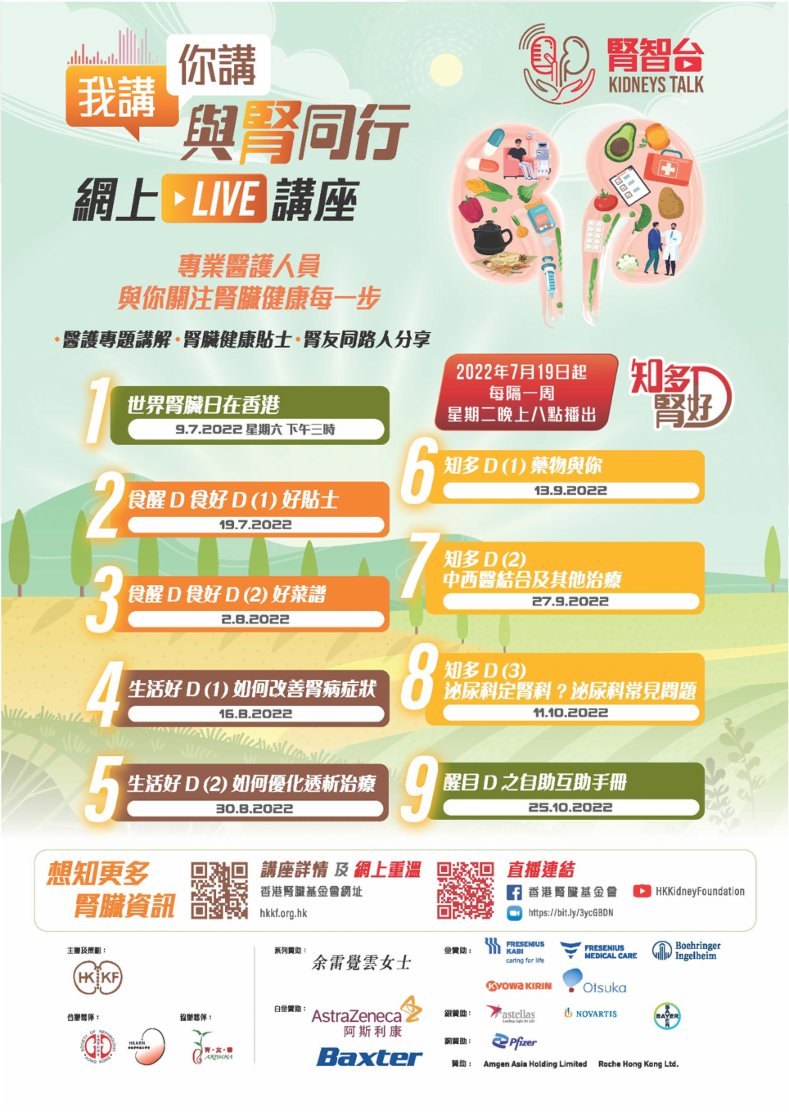 有見及此,香港腎臟基金會聯同香港腎科學會、香港腎科護士學會於去年十月舉辦網上節目——腎智台,以提高大眾對腎病的關注,教導腎友及其照顧者正確的腎臟資訊及治療知識,幫助他們控制病情,減慢病情惡化,盡量維持身體健康及生活質素。腎智台系列一「知多啲,腎好啲」廣受市民歡迎,系列二亦於今年七月十九日起開播,每隔一周的星期二晚上八點播出,每集將講解不同的腎臟專題,有助填補腎病患者的認知不足。歡迎腎友及廣大市民踴躍參與!