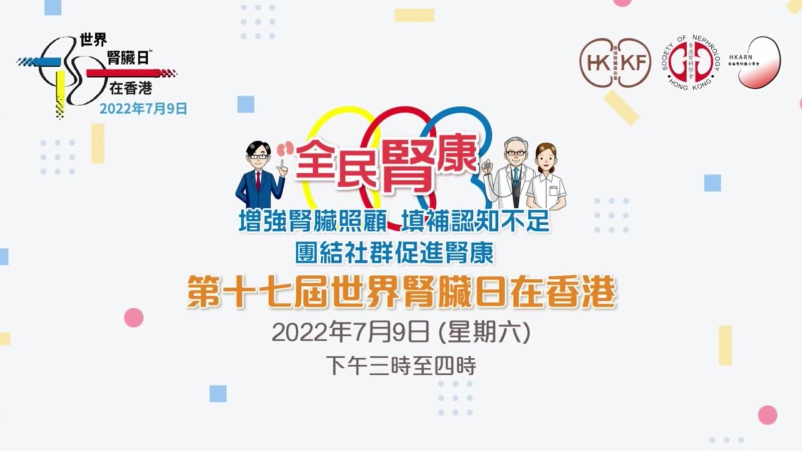 第十七屆世界腎臟日因疫情緣故延期至七月九日(星期六)於中環大館舉行在線網絡研討會及實體活動,活動主題圍繞今年世界腎臟日主題——「全民腎康」,增強腎臟照顧,填補認知不足,團結社群促進腎康。