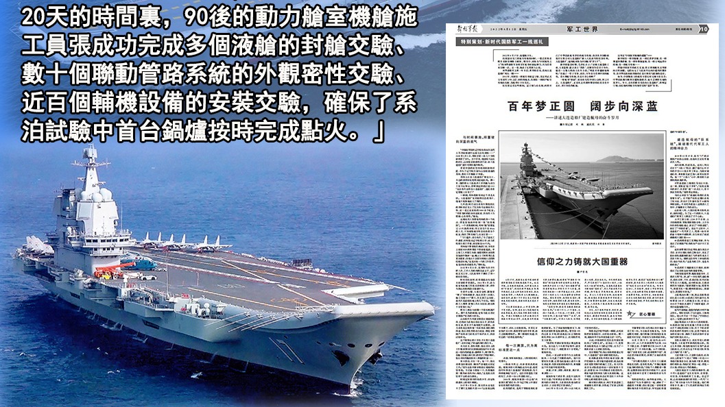文中提到,「為了追趕工作進度,按時完成遼寧艦的交付,動力系統原本的工作量,被壓縮在80天內。」「自出塢到點火不到20天的時間裏,90後的動力艙室機艙施工員張成功完成多個液艙的封艙交驗、數十個聯動管路系統的外觀密性交驗、近百個輔機設備的安裝交驗,確保了系泊試驗中首台鍋爐按時完成點火。」