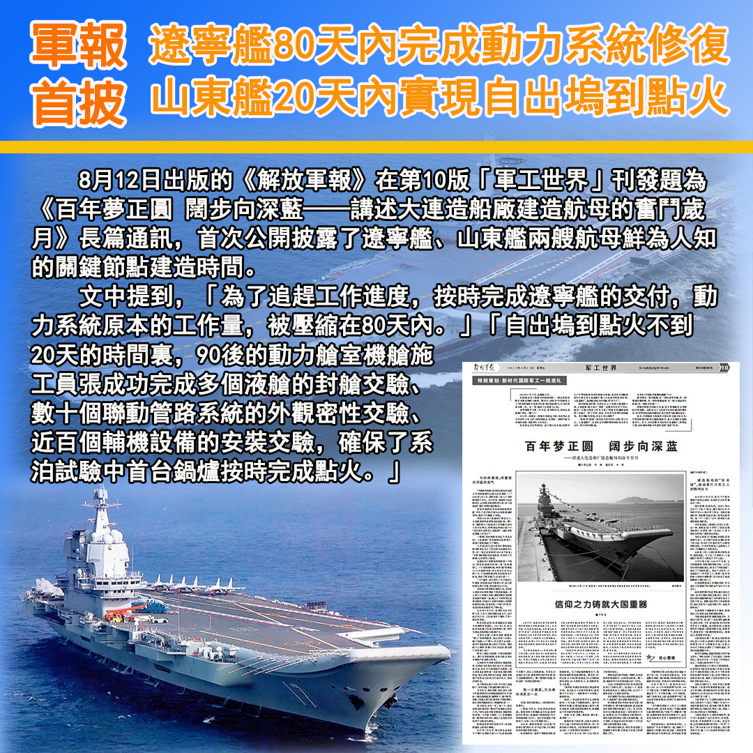 大公文匯全媒體報道,今日(8月12日)出版的《解放軍報》在第10版刊發題為《百年夢正圓 闊步向深藍——講述大連造船廠建造航母的奮鬥歲月》長篇通訊,首次公開披露了遼寧艦、山東艦兩艘航母鮮為人知的關鍵節點建造時間。