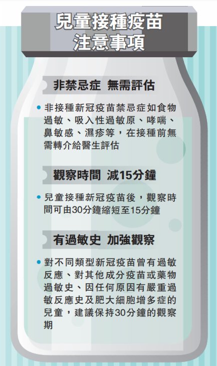 聲明亦建議兒童接種新冠疫苗後,觀察時間可由30分鐘縮短至15分鐘,不過以下接種者在接種疫苗後則建議仍需保持30分鐘的觀察期,包括對不同類型新冠疫苗曾有過敏反應的兒童,例如對復必泰疫苗有過敏的人應在接種科興疫苗後觀察30分鐘;對新冠疫苗或其成分無關的藥物或疫苗過敏史的兒童;因任何原因有嚴重過敏反應史的兒童;肥大細胞增多症的兒童。