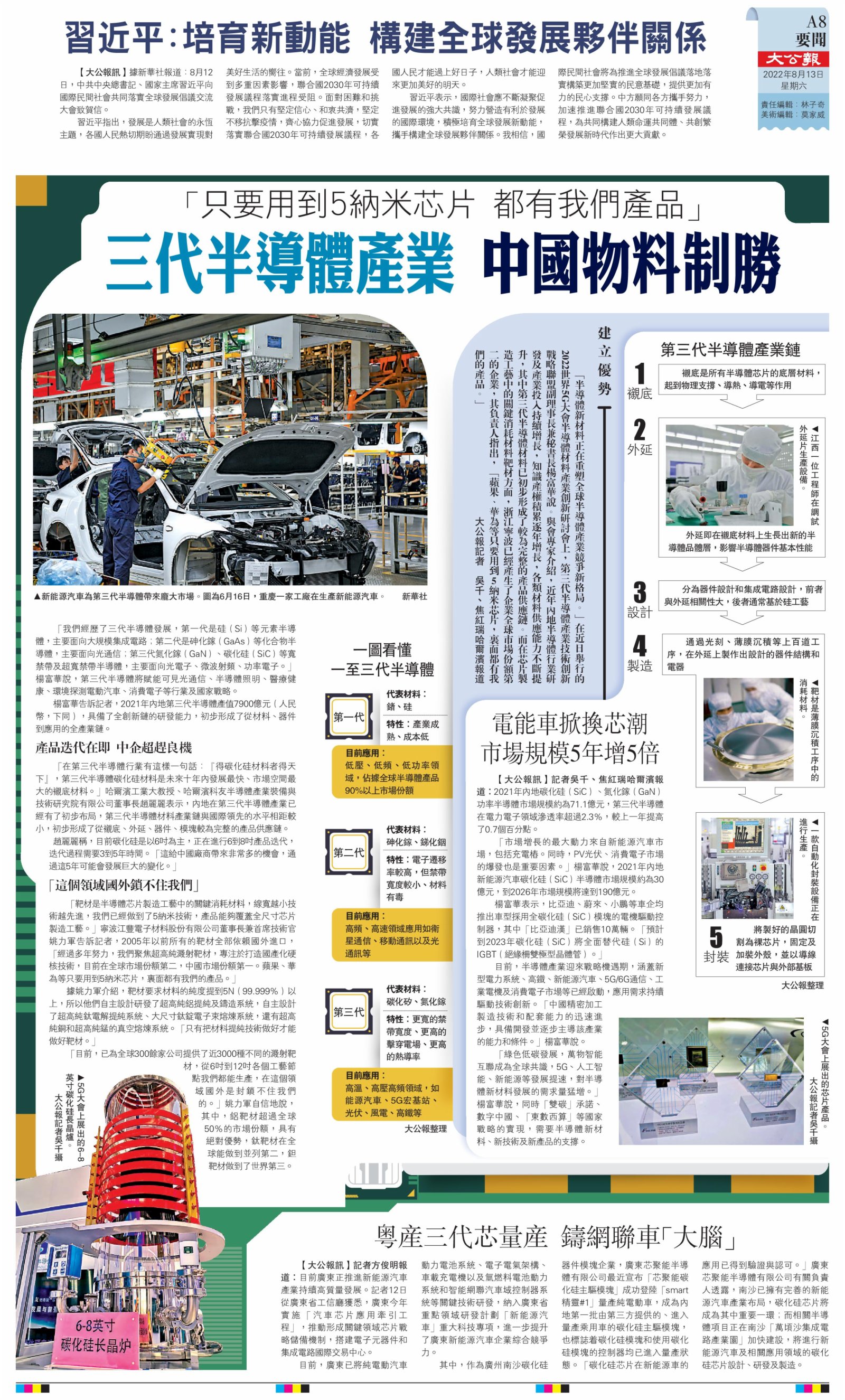 (大公報 記者 吳千、焦紅瑞)「半導體新材料正在重塑全球半導體產業競爭新格局。」在近日舉行的2022世界5G大會半導體材料產業創新研討會上,第三代半導體產業技術創新戰略聯盟副理事長兼秘書長楊富華說。與會專家介紹,近年內地半導體行業研發及產業投入持續增長,知識產權積累逐年增長,各類材料供應能力不斷提升,其中第三代半導體材料已初步形成了較為完整的產品供應鏈。而在芯片製造工藝中的關鍵消耗材料靶材方面,浙江寧波已經產生了企業全球市場份額第二的企業,其負責人指出,「蘋果、華為等只要用到5納米芯片,裏面都有我們的產品。」