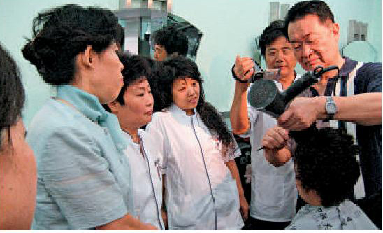 王朝晉多年前曾帶過一位年輕學徒,「剛來時指導他先練『捲槓子』,那孩子每天從早到晚一天就站那兒不停止的捲,沒人督促他,就是靠悟性和自覺。」苦練幾年,年輕人回到故鄉從事美髮業。「我們是國營理髮店,我們的技術能給全國人民造福是應該的,四聯歡迎同行來這邊取經學藝。」王朝晉說。