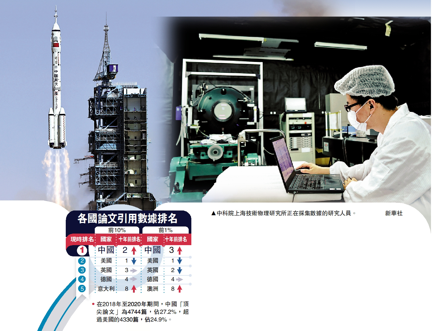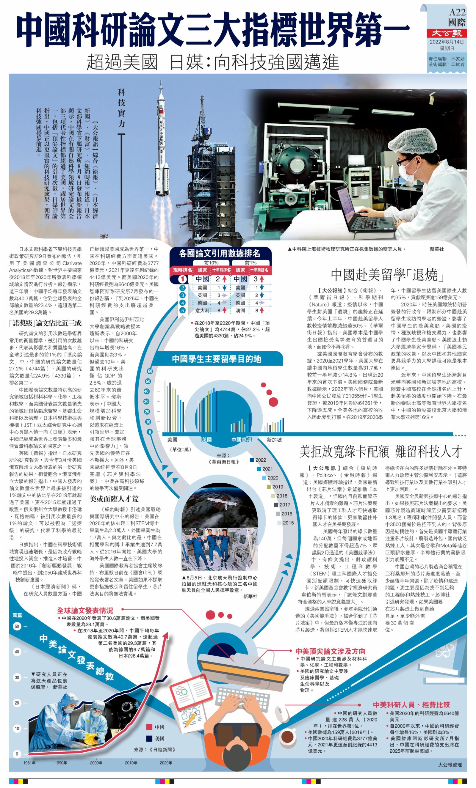 大公報綜合《衛報》、《日本經濟新聞》、《財富》、《紐約時報》報道,日本文部科學省下屬研究所8月9日發布最新報告顯示,中國在有關自然科學領域研究論文的全部三項代表性指標都超過了美國,躍居世界第一,包括「頂尖論文」的引用次數。日媒評論指出,中國正以更堅實的科技研究成果,朝着科技強國穩步前進。