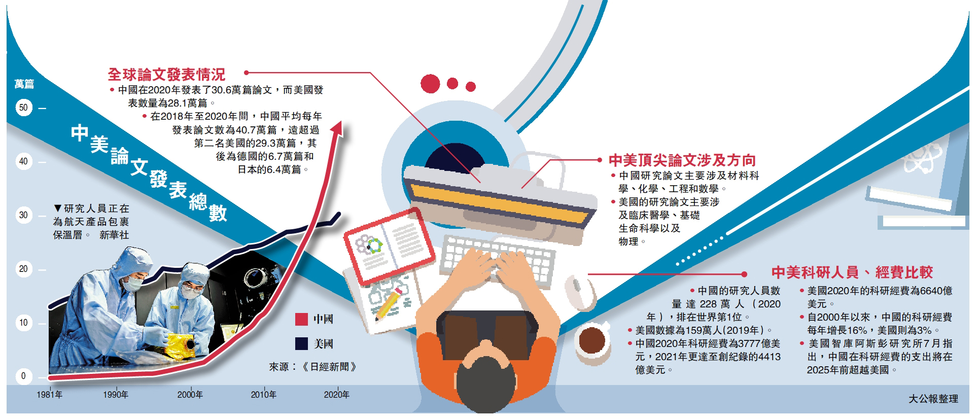 《日本經濟新聞》稱,在研究人員數量方面,中國已經超越美國成為世界第一,中國在科研經費方面直追美國。2020年,中國科研經費為3777億美元,2021年更達至創紀錄的4413億美元。而美國2020年的科研經費則為6640億美元。美國智庫阿斯彭研究所7月發布的一份報告稱,「到2025年,中國在科研經費的支出將超越美國。」