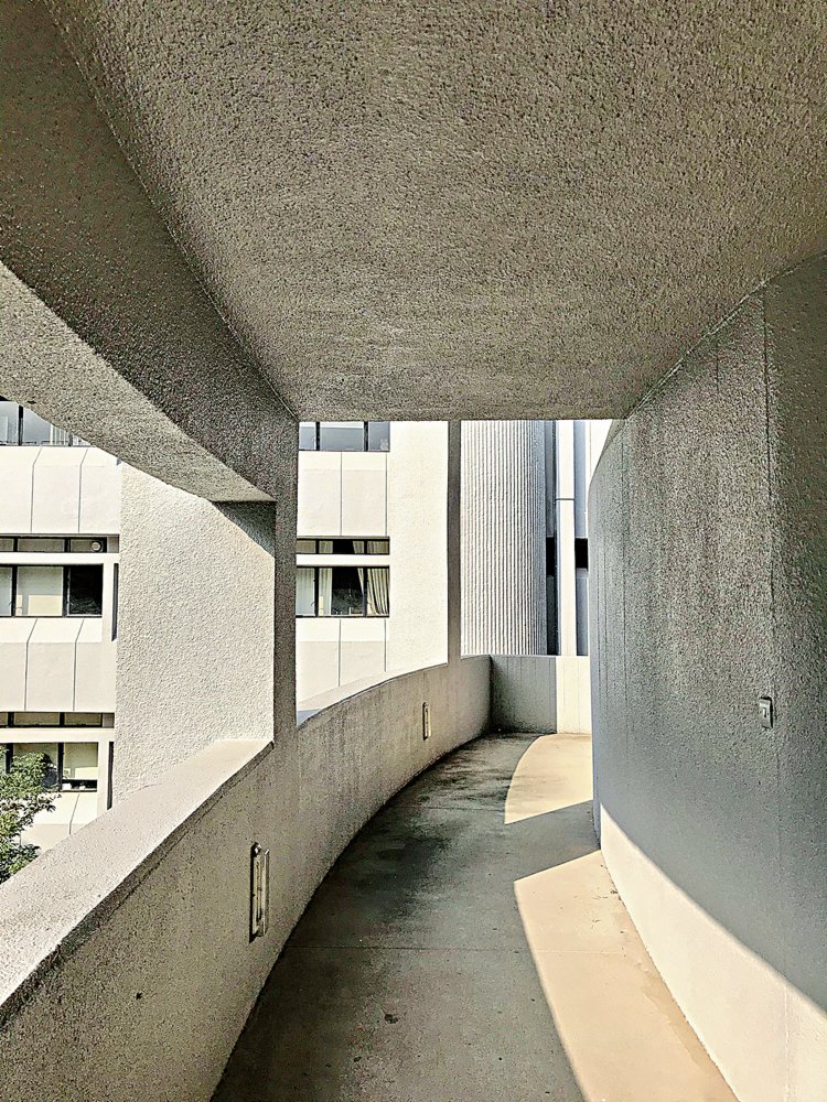 每個書院都好像是一個小小的社區,有着自己特色的建築形象、空間圍合方式甚至氤氳着一股說不清道不明的獨特氣質。與新亞書院同為最早的三所創始書院之一的聯合書院,於二十世紀七十年代統一規劃設計,具有典型的現代主義建築風格,樸素、注重功能、舒展的橫向線條構成建築群的主要特色。同時受二十世紀六十至七十年代風靡全球的粗野主義風格的影響,外露的不修邊幅的混凝土結構及其毛糙、沉重、粗野的質感使得聯合書院建築群更自然、豪邁地匍匐於山體之上。