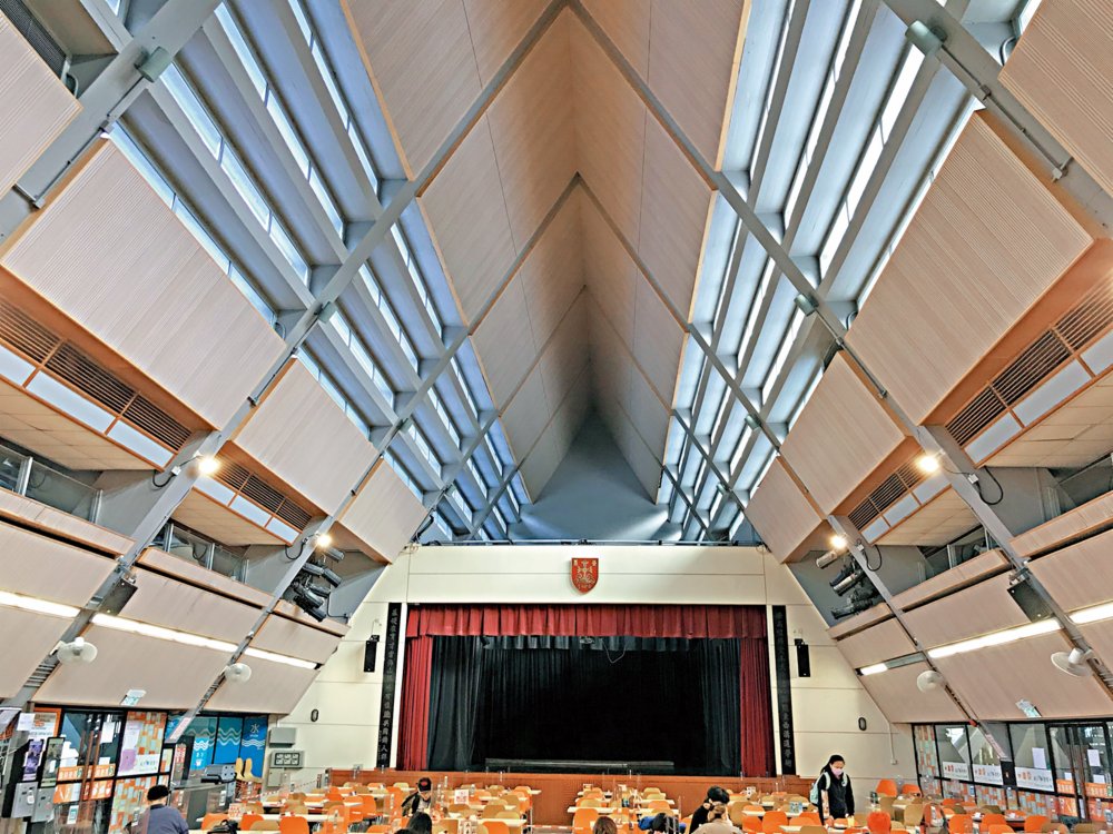 環抱山腳未圓湖的崇基學院更是中大校園的元老級「人物」。學院的主要建築都圍繞未圓湖分布,未圓湖的名字又與學院校訓「止於至善」相呼應。湖本身未圓而帶若干彎角,而人生世事又何嘗能得圓滿,只可努力不懈、力臻至善。湖水平靜如鏡,連排的落羽松葉紅似火,影綽其間的白色建築便是另一粗野主義建築的代表作──眾志堂。三角形的建築形象在一眾方盒子中獨樹一幟,內部空間和外部形象保持高度一致,利落的屋脊線直穿建築,兩側高窗均勻地灑下柔和的漫射光,木質的內部裝修像是給冰冷的粗野主義建築披上溫暖的棉衣,營造出適合學生活動中心功能的熱鬧氛圍。三角形兩側出挑的夾層空間在首層形成線性的半室外活動空間,木色的地板搭配連續的灰色結構像是一條時空隧道,整個建築都動感十足起來。