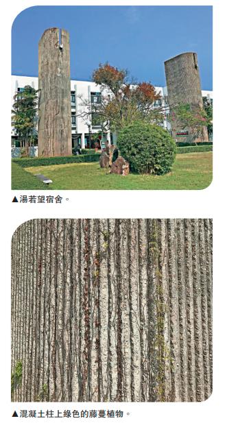 湯若望宿舍的兩個側邊核心筒,由深灰的豎紋混凝土包裹而成,和主體建築的白色、輕盈形成巨大的視覺反差,極高、極粗糲的形象本應讓人敬畏或是疏離,細細看去,混凝土的一個個豎向凹槽中竟攀附着一條條細細密密的綠色植物,彎彎斜斜、纏綿繾綣,感覺一切又變得溫柔和煦起來。對面的張祝珊師生康樂大樓也是類似的風格,同樣的強調水平線條,表達手法又略有不同,上部三層混凝土退台與下部的白色建築體量在反差中微妙地協調,陽光在山牆上留下硬朗的投影,灰色退台邊緣連成一片的紅色小花旺盛地生長,一團天真活潑。另一側的胡忠圖書館,水平延伸的三層樓板和高聳豎直的混凝土水塔構成絕佳的視覺平衡。沿台階上行轉入圖書館另一側,一片綠草如茵的開放場地豁然闖入視野,淺綠的草地、深墨綠的松樹、翠綠的灌木叢、橙黃的不知名的樹,生機盎然,目之所及盡是絕美的秋日油畫。