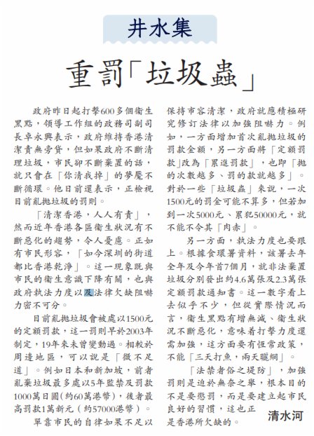 「法禁者俗之堤防」,加強罰則是迫於無奈之舉,根本目的不是要懲罰,而是要建立起市民良好的習慣,這也正是香港所欠缺的。