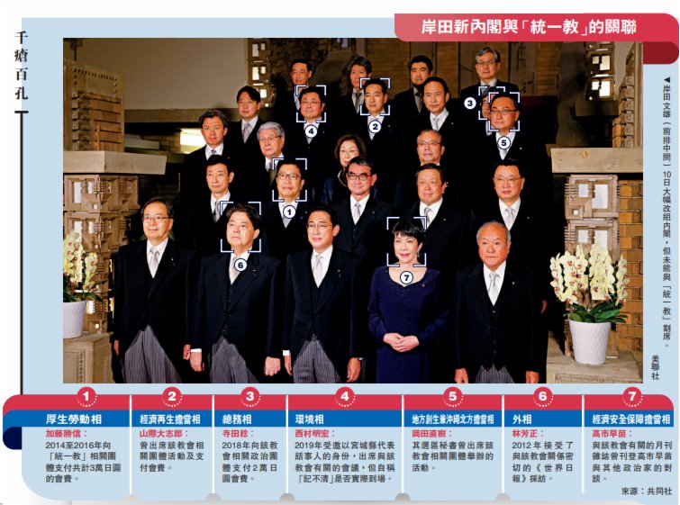 據日本評論家原彰宏統計,安倍的11名閣僚、前首相菅義偉的9名閣僚與「統一教」有關聯。安倍遇刺後,日媒指出現任首相岸田文雄內閣裏亦有至少7人與該教會有關,即便大幅改組也沒能解決問題。