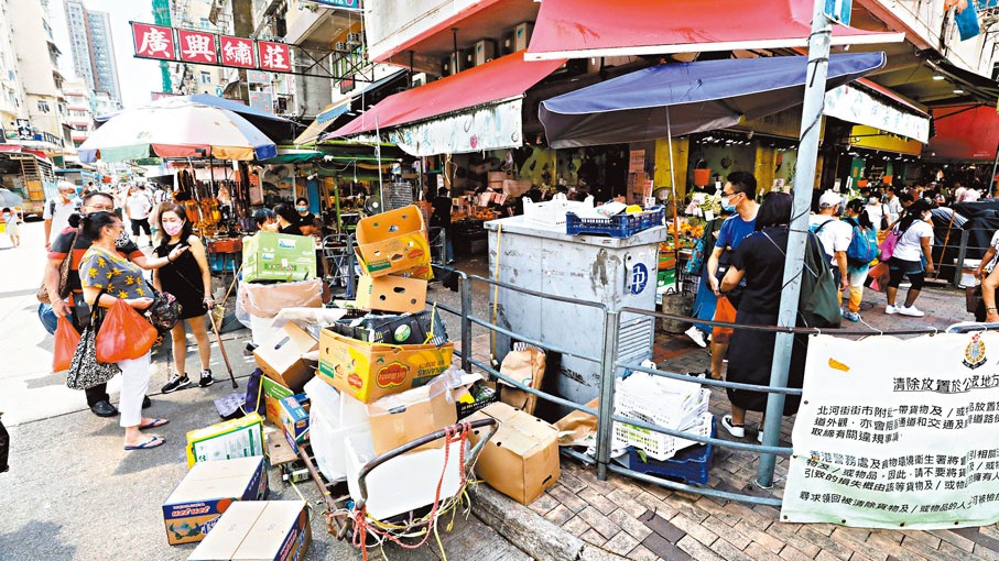 至於一直是衞生黑點「常客」的北河街街市一帶,現場所見仍有不少商戶將貨品及發泡膠箱等擺出街道,地面有一攤攤積水;街市對出一間蔬果店外,亦堆疊一個個菜籃、紙皮等。