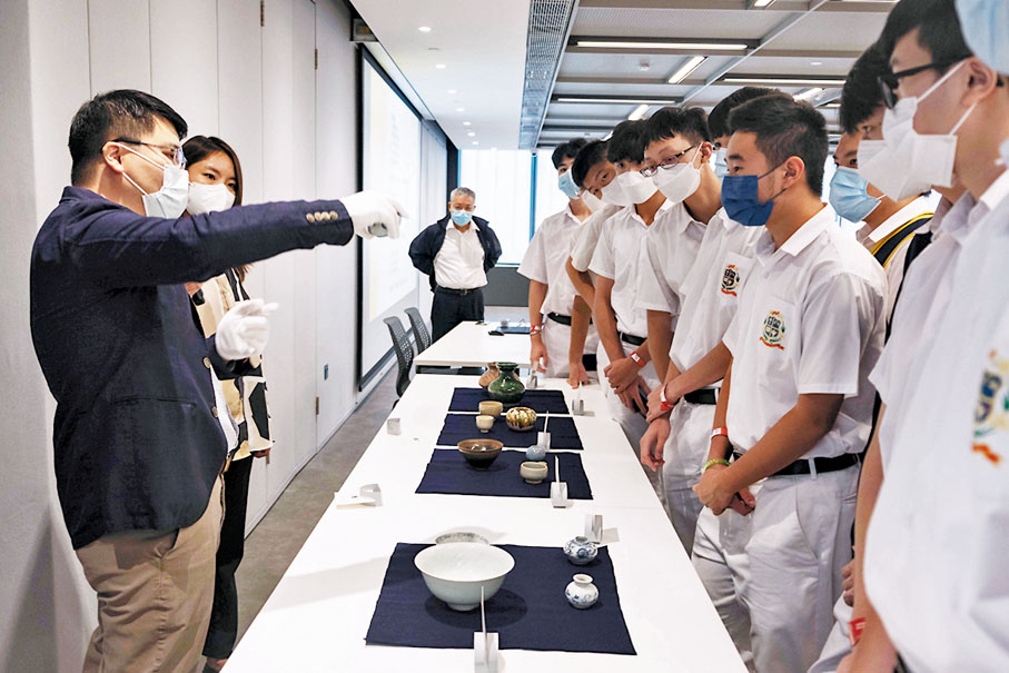 (香港文匯報記者 鍾健文)為培養學生和青年人對中華文化藝術和歷史的興趣,香港故宮文化博物館與本地學校及教育機構建立長期策略夥伴合作,提供原創教材、新穎教學方法與教師培訓,令學與教均更多姿多彩。香港文匯報日前直擊採訪了故宮館舉辦的一場以陶瓷為主題的「觸得到的文物」工作坊,由中國古美術專家李宗鴻,為聖若瑟英文中學38名高中生深入講解中國陶瓷歷史與知識,同學們更有機會戴起手套,親手拿起及觸摸包括戰國時期原始青瓷碗、唐三彩杯、清代青花小罐等珍貴陶瓷文物,「零距離」全方位感受中國數千年文明的氣息與風采。