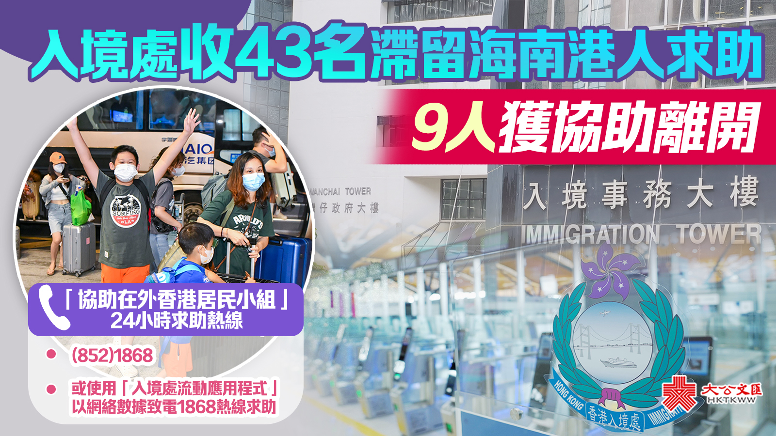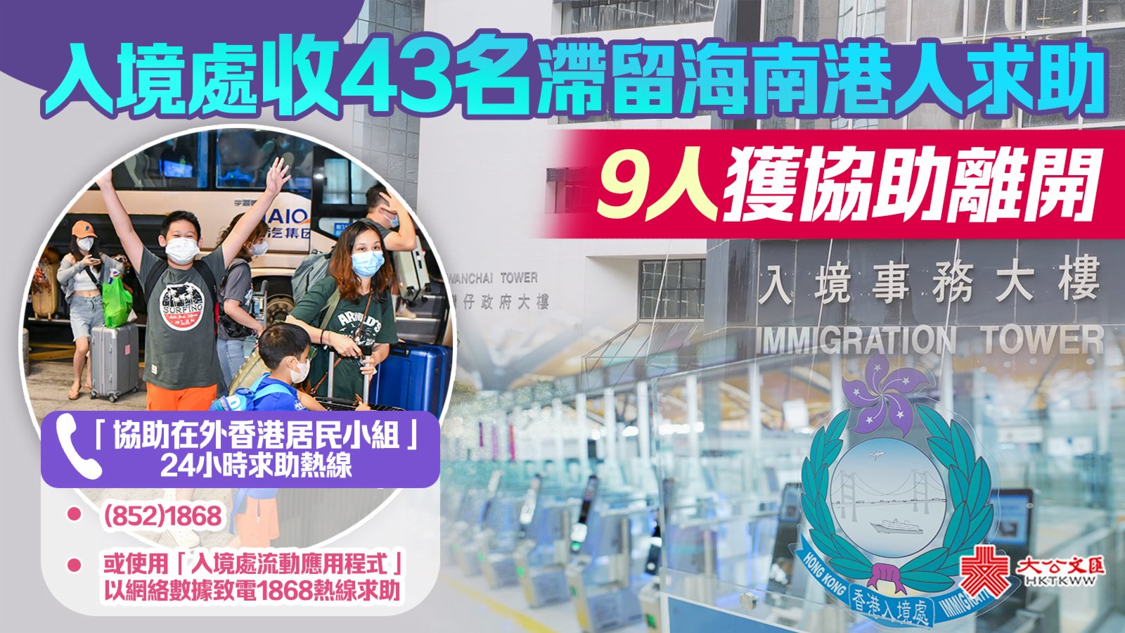 大公文匯全媒體報道,海南疫情持續蔓延,本輪疫情以來,累計報告8883例陽性感染者,當地實施嚴密的防疫措施,有不少遊客滯留。入境處今日(15日)表示,截至目前共接獲43名滯留海南的港人求助,在駐粵辦協助下,當中9人已離開海南前往內地其他城市,會繼續與其他求助港人保持聯繫,及與海南相關部門協調,爭取求助港人盡快離開海南。