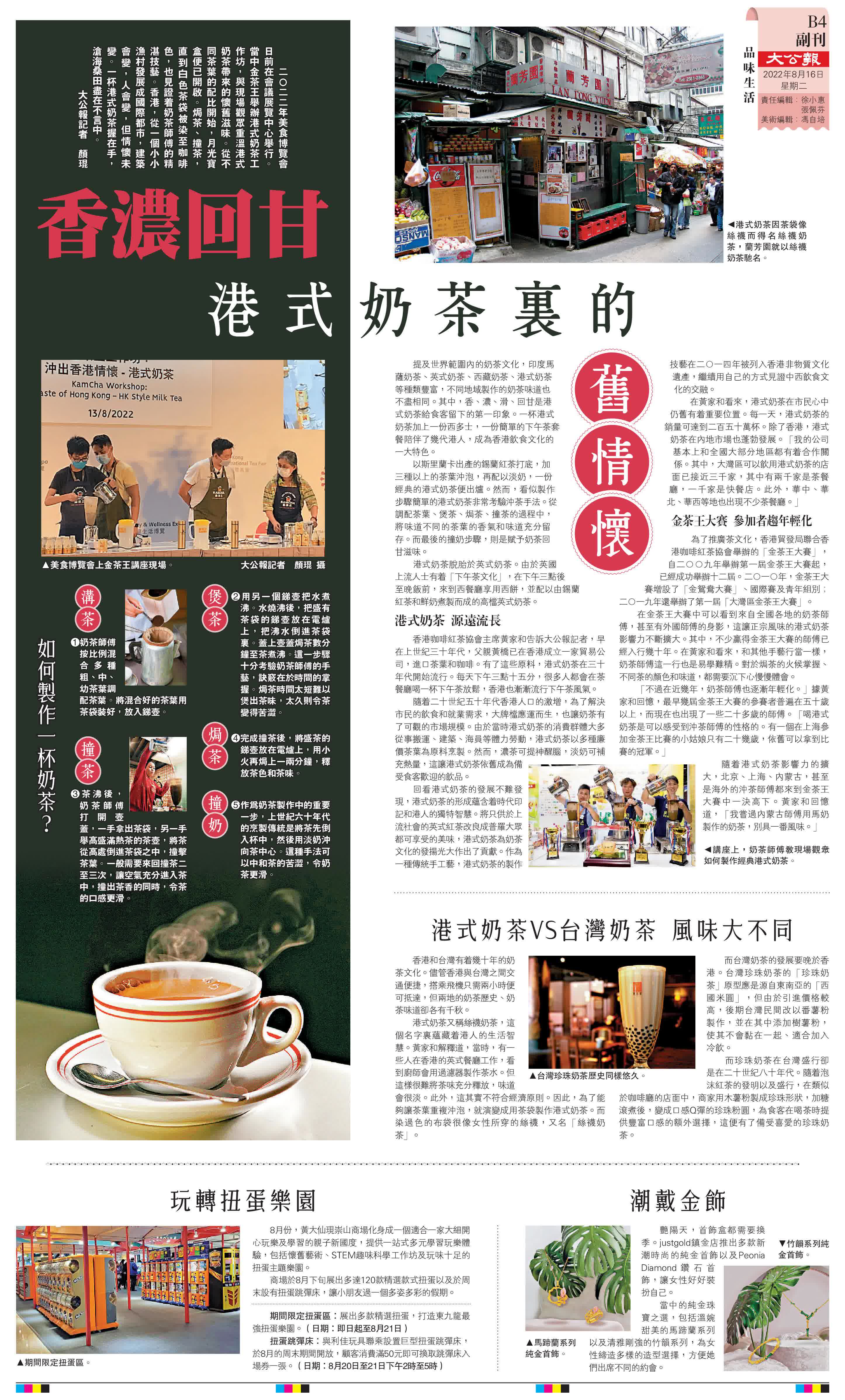 回看港式奶茶的發展不難發現,港式奶茶的形成蘊含着時代印記和港人的獨特智慧。將只供於上流社會的英式紅茶改良成普羅大眾都可享受的美味,港式奶茶為奶茶文化的發揚光大作出了貢獻。作為一種傳統手工藝,港式奶茶的製作技藝在二○一四年被列入香港非物質文化遺產,繼續用自己的方式見證中西飲食文化的交融。