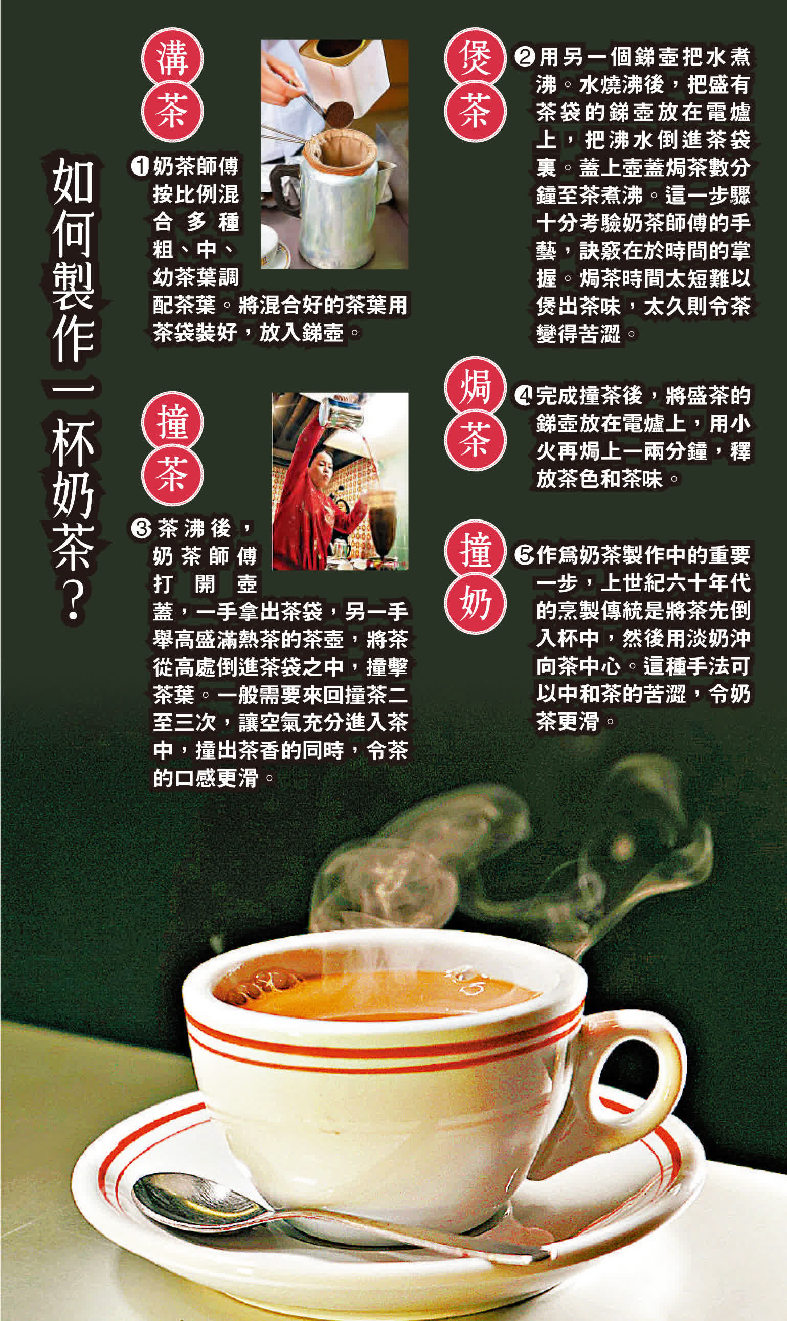 以斯里蘭卡出產的錫蘭紅茶打底,加三種以上的茶葉沖泡,再配以淡奶,一份經典的港式奶茶便出爐。然而,看似製作步驟簡單的港式奶茶非常考驗沖茶手法。從調配茶葉、煲茶、焗茶、撞茶的過程中,將味道不同的茶葉的香氣和味道充分留存。而最後的撞奶步驟,則是賦予奶茶回甘滋味。