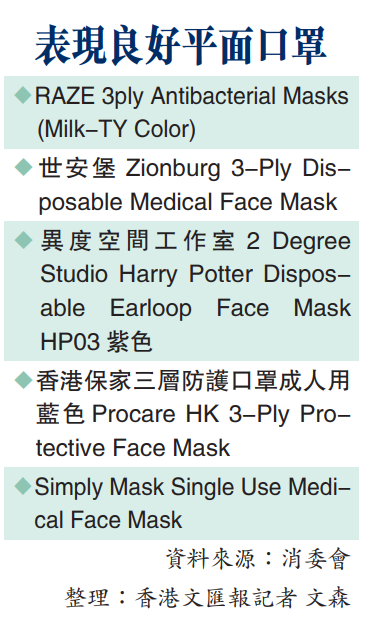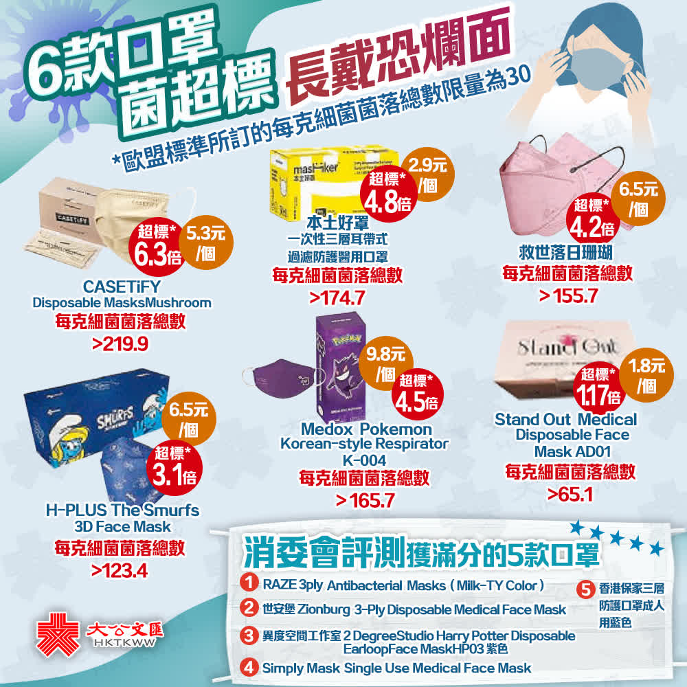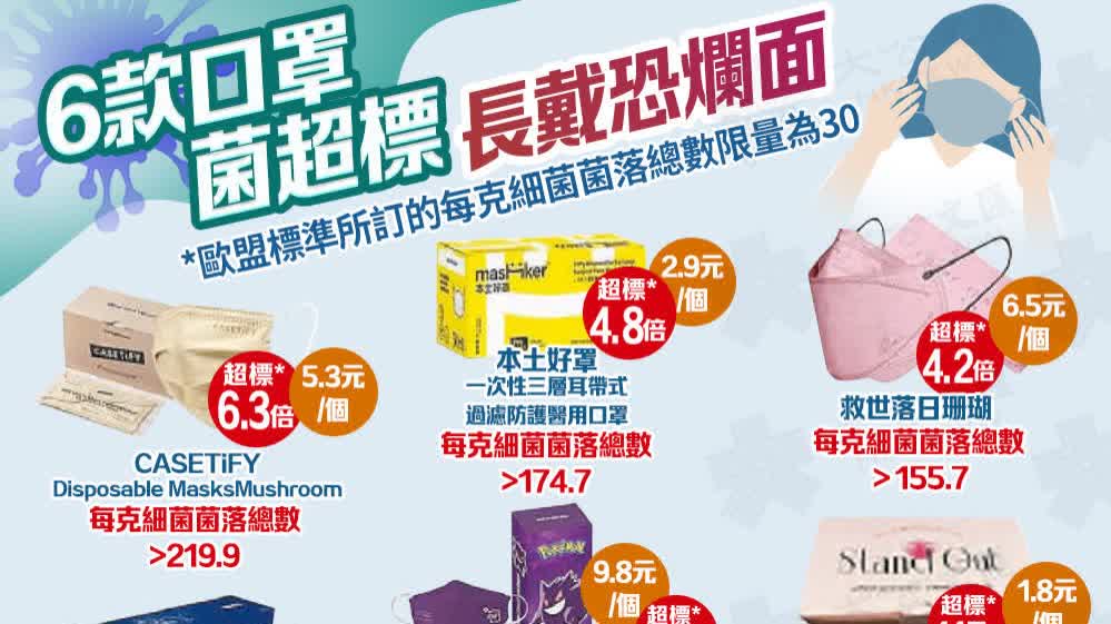 (香港文匯報記者 文森)七彩口罩方便配搭衣着,但需留意口罩質素。消委會最新一期《選擇》月刊昨日公布30款一次性彩色口罩測試結果,雖然未發現有害染料,但6款口罩含菌量超出歐盟標準,最嚴重一款為「CASETiFY」,超標6.33倍。由於口罩動輒佩戴半天甚至全天,長期透過口罩接觸細菌,容易引起面部皮膚過敏,對免疫力較弱人士的健康風險較大,上述口罩未達安全標準,涉違反《消費品安全條例》,已轉交海關跟進;另外六成被抽查的口罩顆粒過濾效率差過產品聲稱。消委會促請特區政府加強規管外科口罩,並制訂清晰的產品質素指引。海關則表示,若發現抵觸法例會採取執法行動。