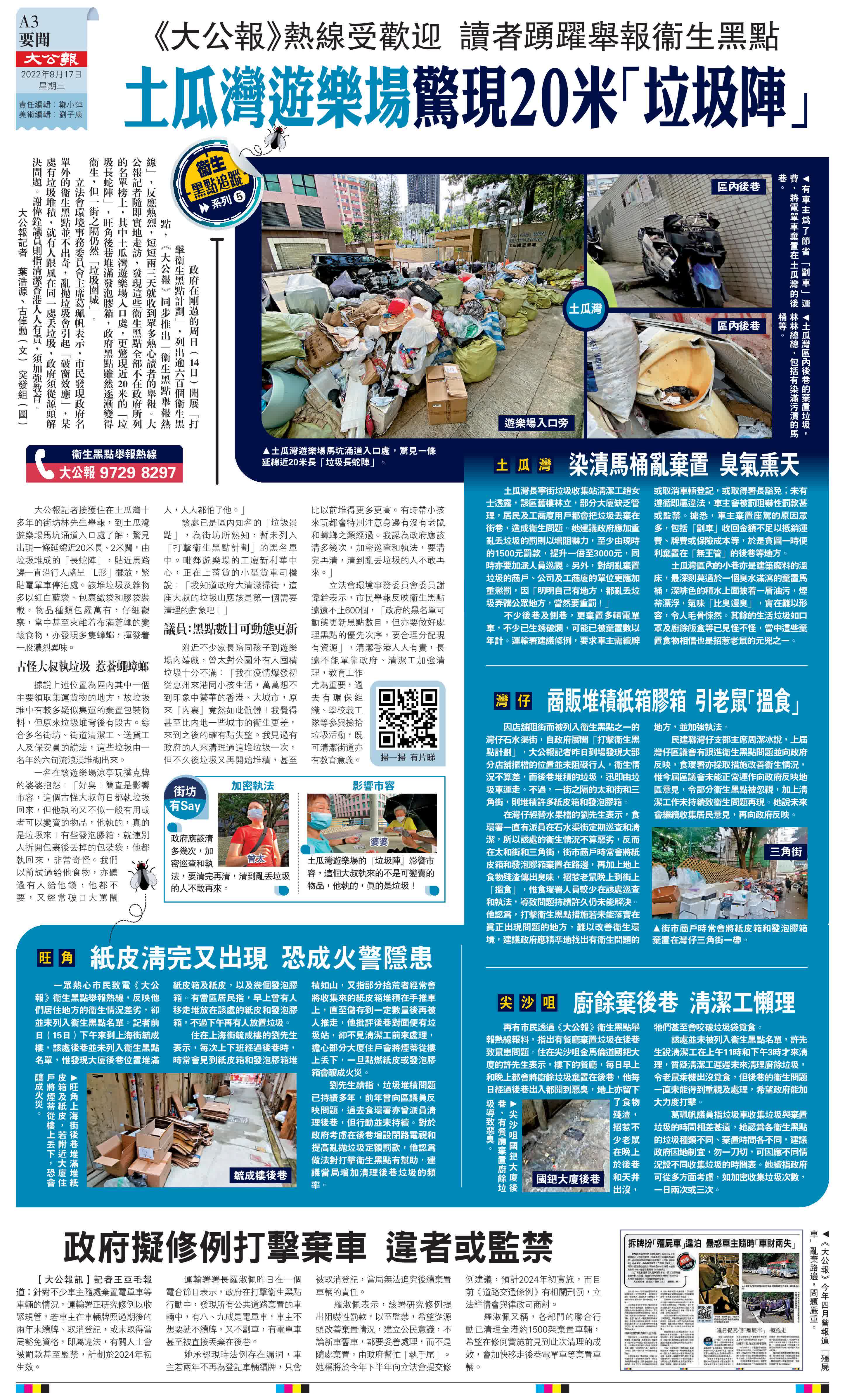 (大公報記者 葉浩源、古倬勳<文> 突發組<圖>)政府在剛過的周日(14日)開展「打擊衞生黑點計劃」,列出逾六百個衞生黑點,《大公報》同步推出「衞生黑點舉報熱線」,反應熱烈,短短兩三天就收到眾多熱心讀者的舉報。大公報記者隨即實地走訪,發現這些衞生黑點全部不在政府所列的名單榜上,其中土瓜灣遊樂場入口處,更驚現近20米的「垃圾長蛇陣」,旺角後巷堆滿發泡膠箱,政府黑點雖然逐漸變得衞生,但一街之隔仍然「垃圾圍城」。