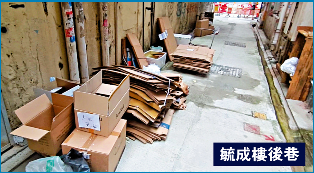 住在上海街毓成樓的劉先生表示,每次上下班經過後巷時,時常會見到紙皮箱和發泡膠箱堆積如山,又指部分拾荒者經常會將收集來的紙皮箱堆積在手推車上,直至儲存到一定數量後再被人推走,他批評後巷對面便有垃圾站,卻不見清潔工前來處理,擔心部分大廈住戶會將煙蒂從樓上丟下,一旦點燃紙皮或發泡膠箱會釀成火災。