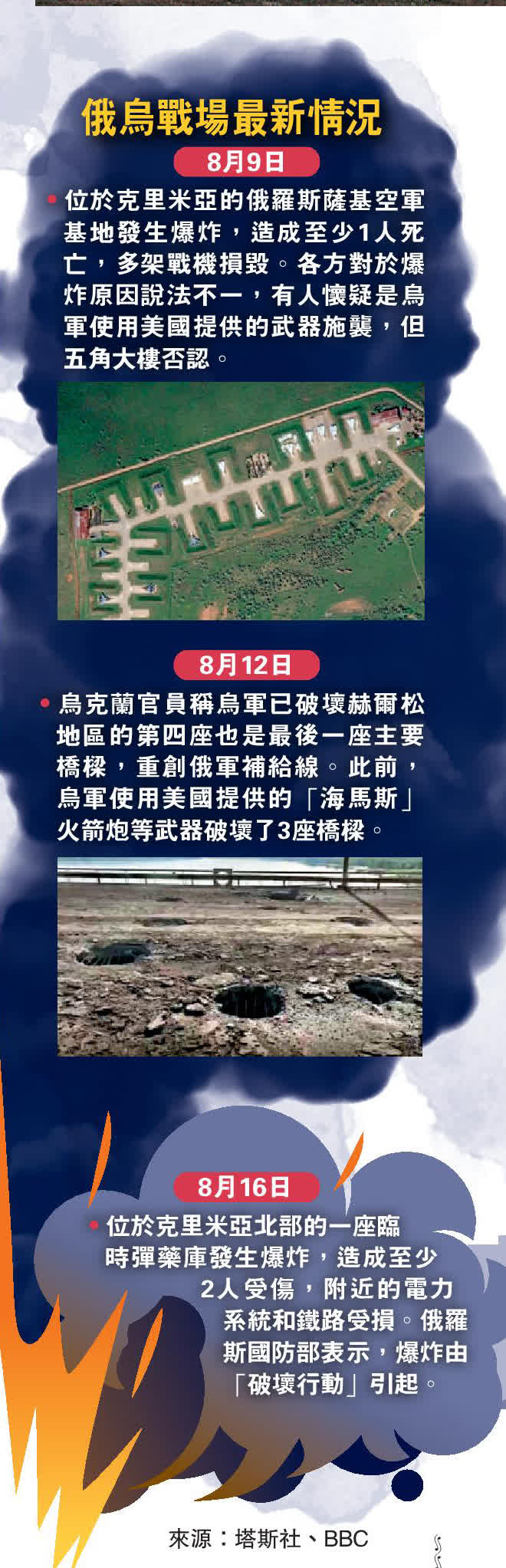 大公報綜合塔斯社、美聯社、CNN報道:俄軍位於克里米亞北部的一座彈藥庫16日發生爆炸,附近的變電站、鐵軌等設施受損。俄羅斯國防部表示,這次爆炸事件由「破壞行動」引發,但並未說明是哪一方勢力發動襲擊。烏克蘭官員聲稱,一支深入敵後的烏軍精銳部隊製造了爆炸事件。這是短短一周時間裏克里米亞第二次遇襲,俄軍在當地的薩基空軍基地9日亦發生爆炸,多架軍機受損。