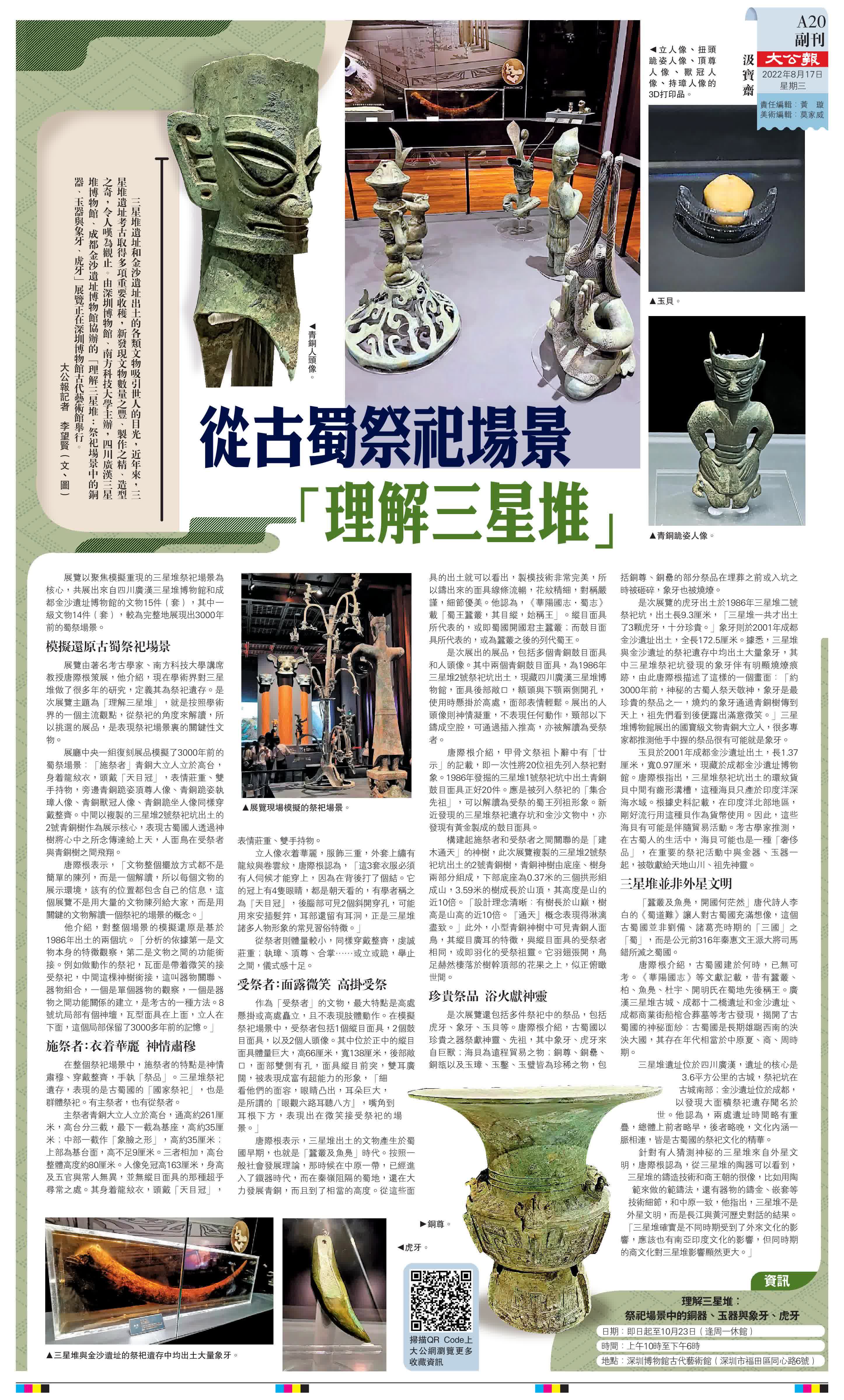 (大公報 記者 李望賢)三星堆遺址和金沙遺址出土的各類文物吸引世人的目光,近年來,三星堆遺址考古取得多項重要收穫,新發現文物數量之豐、製作之精、造型之奇,令人嘆為觀止。由深圳博物館、南方科技大學主辦,四川廣漢三星堆博物館、成都金沙遺址博物館協辦的「理解三星堆:祭祀場景中的銅器、玉器與象牙、虎牙」展覽正在深圳博物館古代藝術館舉行。