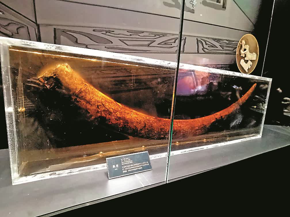 是次展覽的虎牙出土於1986年三星堆二號祭祀坑,出土長9.3厘米,「三星堆一共才出土了3顆虎牙,十分珍貴。」象牙則於2001年成都金沙遺址出土,全長172.5厘米。據悉,三星堆與金沙遺址的祭祀遺存中均出土大量象牙,其中三星堆祭祀坑發現的象牙伴有明顯燒燎痕跡,由此唐際根描述了這樣的一個畫面:「約3000年前,神秘的古蜀人祭天敬神,象牙是最珍貴的祭品之一,燒灼的象牙通過青銅樹傳到天上,祖先們看到後便露出滿意微笑。」三星堆博物館展出的國寶級文物青銅大立人,很多專家都推測他手中握的祭品很有可能就是象牙。