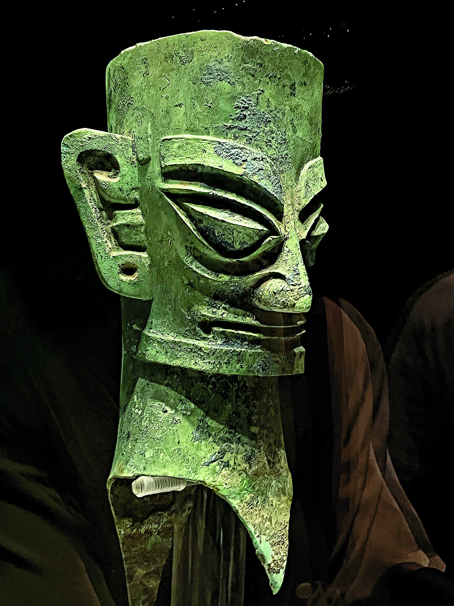 是次展出的展品,包括多個青銅鼓目面具和人頭像。其中兩個青銅鼓目面具,為1986年三星堆2號祭祀坑出土,現藏四川廣漢三星堆博物館,面具後部敞口,額頭與下顎兩側開孔,使用時懸掛於高處,面部表情輕鬆。展出的人頭像則神情凝重,不表現任何動作,頸部以下鑄成空腔,可通過插入推高,亦被解讀為受祭者。