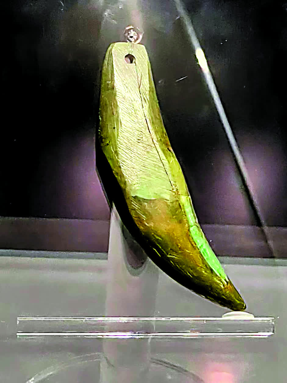 玉貝於2001年成都金沙遺址出土,長1.37厘米,寬0.97厘米,現藏於成都金沙遺址博物館。唐際根指出,三星堆祭祀坑出土的環紋貨貝中間有齒形溝槽,這種海貝只產於印度洋深海水域。根據史料記載,在印度洋北部地區,剛好流行用這種貝作為貨幣使用。因此,這些海貝有可能是伴隨貿易活動。考古學家推測,在古蜀人的生活中,海貝可能也是一種「奢侈品」,在重要的祭祀活動中與金器、玉器一起,被敬獻給天地山川、祖先神靈。