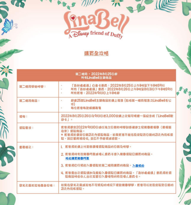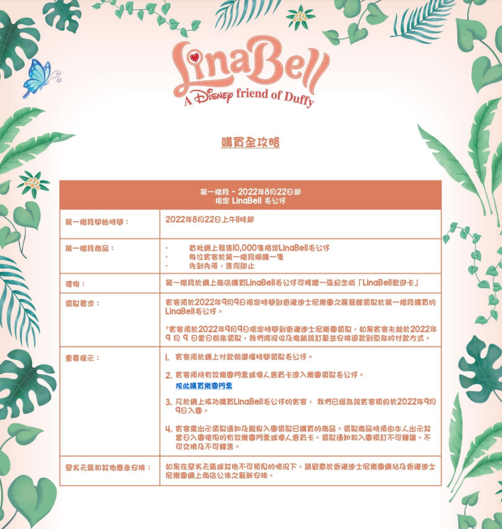 市民於第一階段及第二階段購買的Linabell(玲娜貝兒)產品可於9月9日起,於香港迪士尼樂園內親身領取。