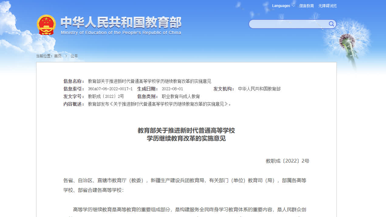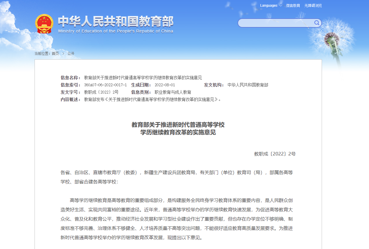 新華社報道,教育部近日印發《教育部關於推進新時代普通高等學校學歷繼續教育改革的實施意見》,要求自2025年秋季起,高等學歷繼續教育不再使用「函授」「業餘」的名稱,統一為「非脫產」,主辦高校可根據專業特點和學生需求等,靈活採取線上線下相結合形式教學。