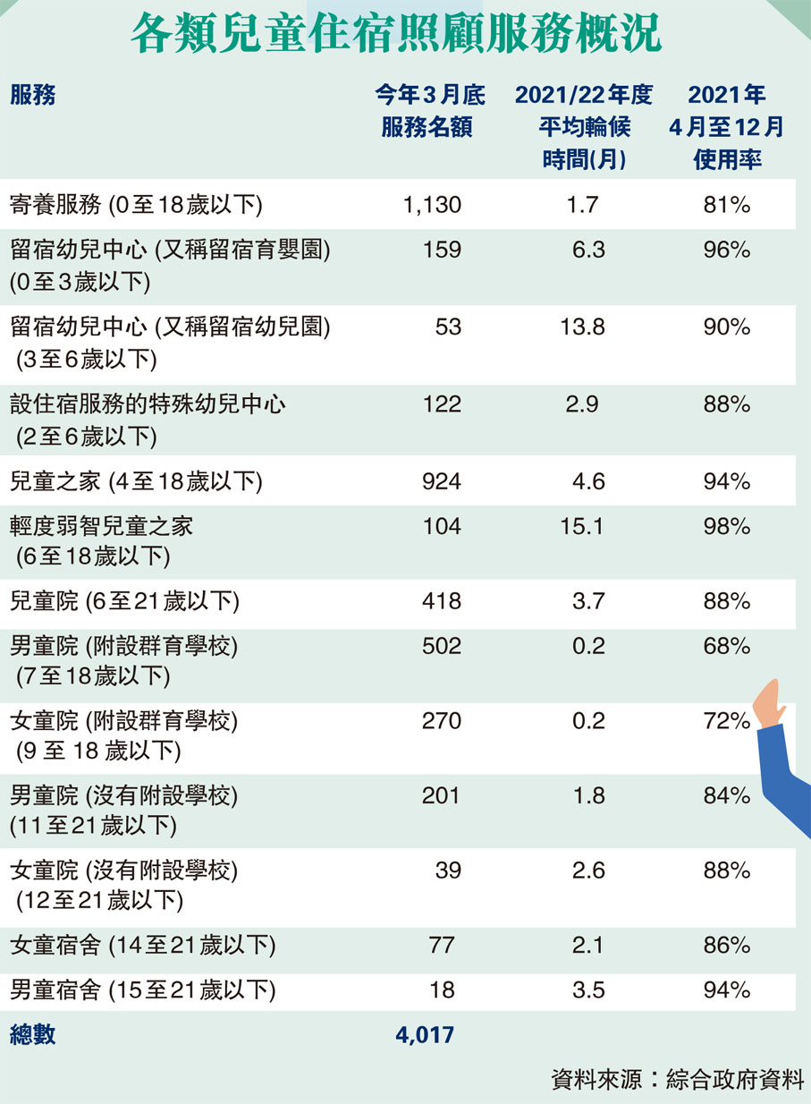 目前留宿幼兒中心的宿位使用率處於高水平,檢討委員會在檢視服務規劃及供應量後,提及7項建議,指出須為各類兒童住宿照顧服務作長遠規劃,建議除透過不同發展項目增加兒童福利處所的宿位外,亦建議加強寄養服務,招募更多寄養家庭提供支援,讓更多有需要的兒童可以在家庭式的環境下健康成長。