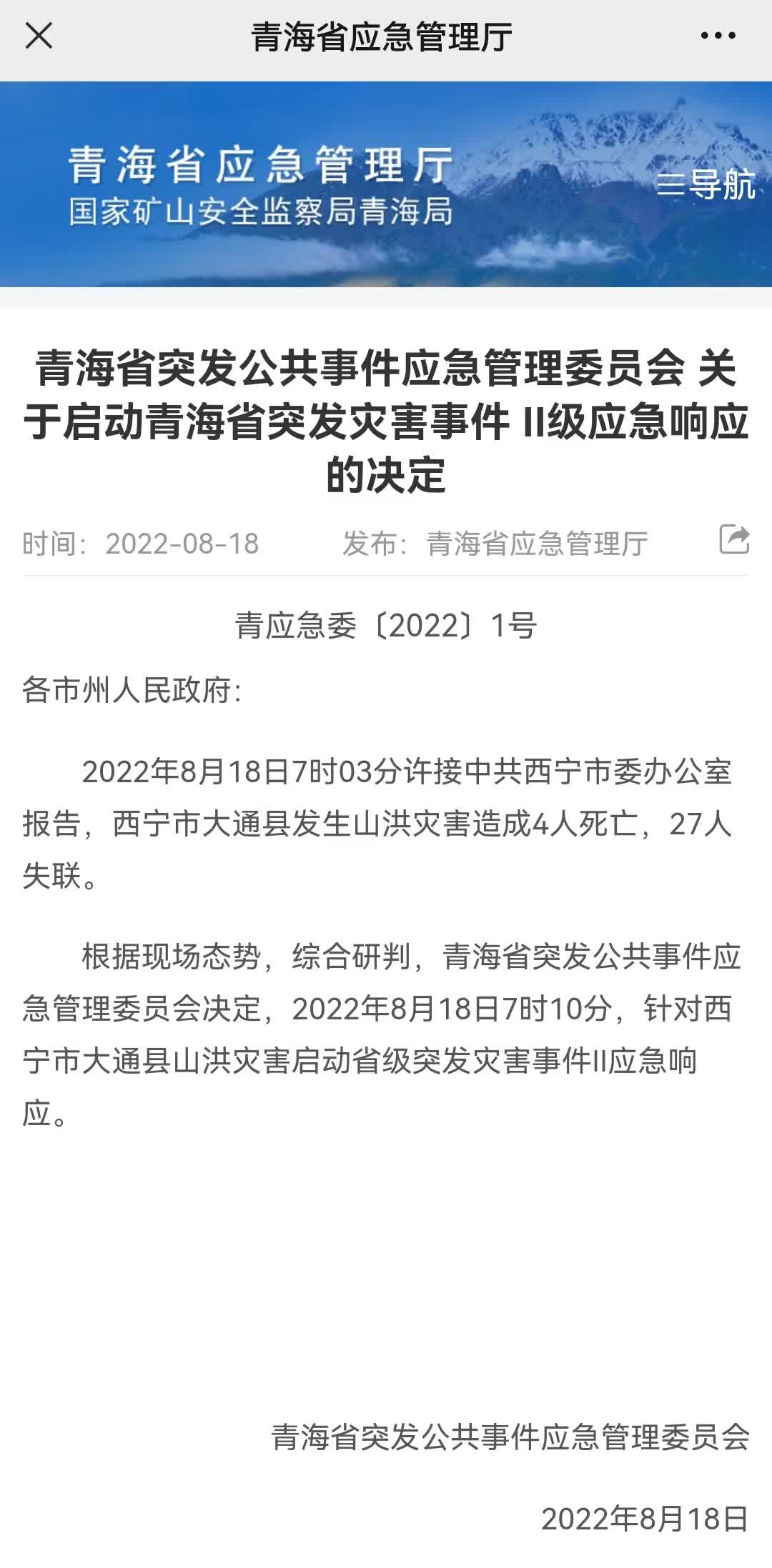 據青海省應急管理廳網站8月18日消息,2022年8月18日7時03分許接中共西寧市委辦公室報告,西寧市大通縣發生山洪災害造成4人死亡,27人失聯。
