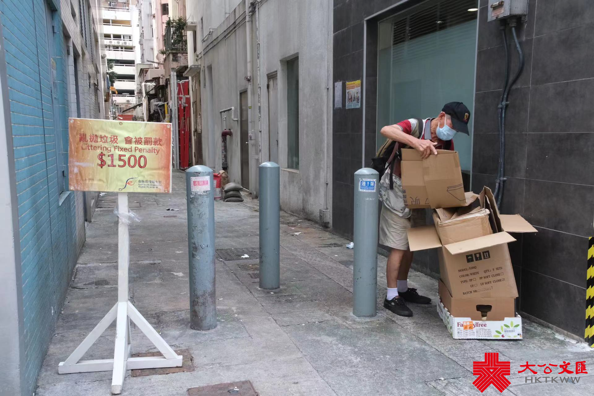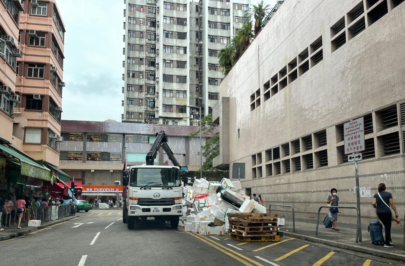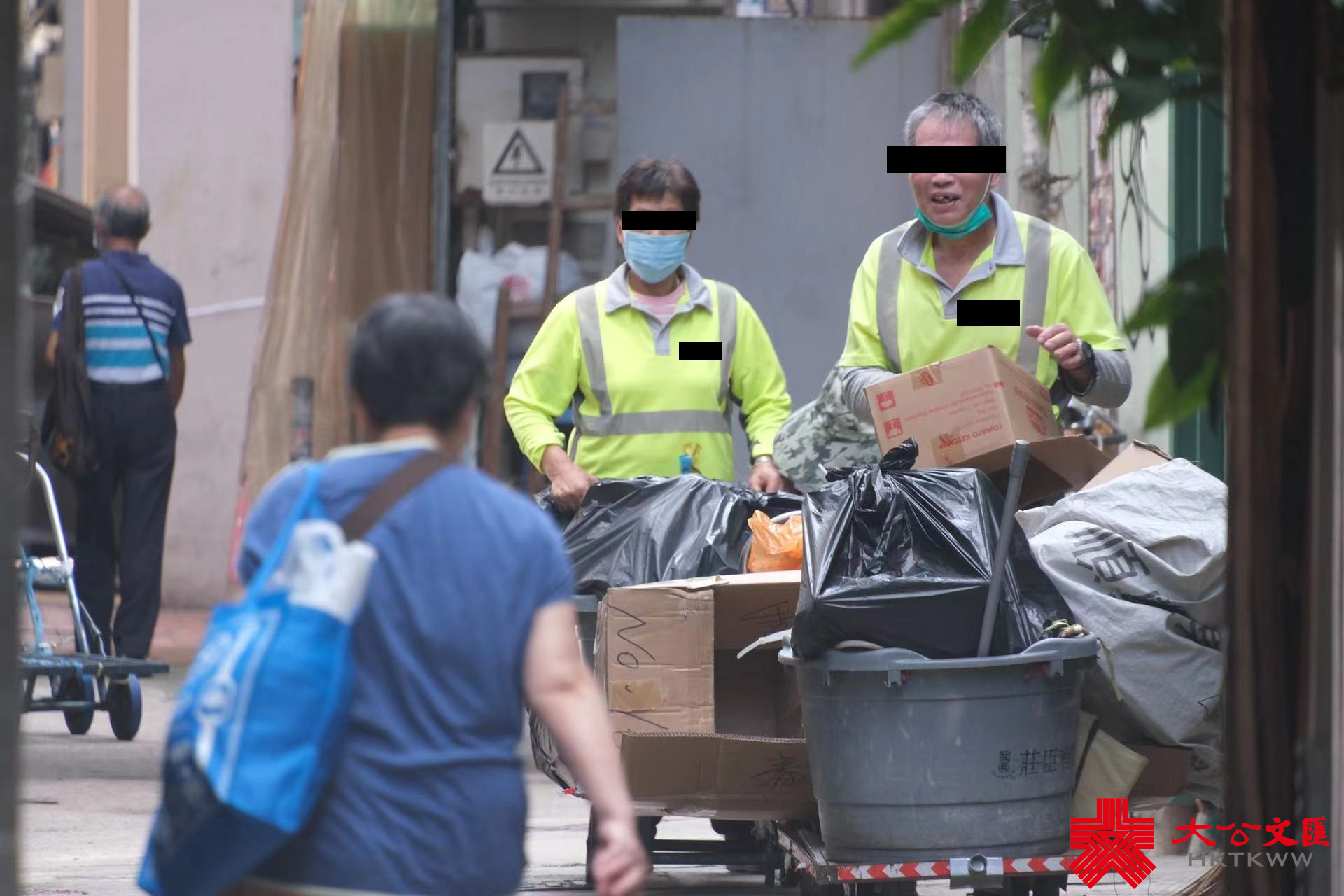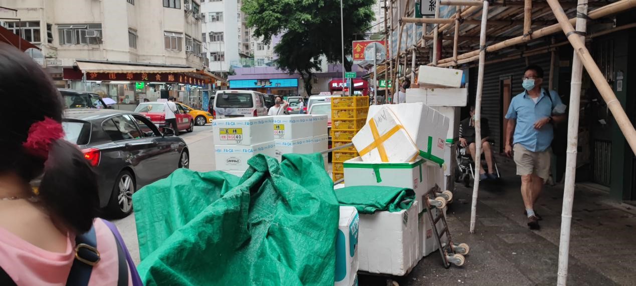 位於港島灣仔區威非路道5X巴士總站及銅鑼灣街市後巷處,只見有人用手推車將紙皮、發泡膠及帆布等雜物推往後巷存放,現場環境惡劣,衞生情況欠佳。在炎炎夏日底下,食環署清潔工只佩帶基本防疫裝備,努力清理附近的垃圾及污水,有工友更不耐炎熱天氣,暫時將口罩脫下,令人擔心感染疾病。