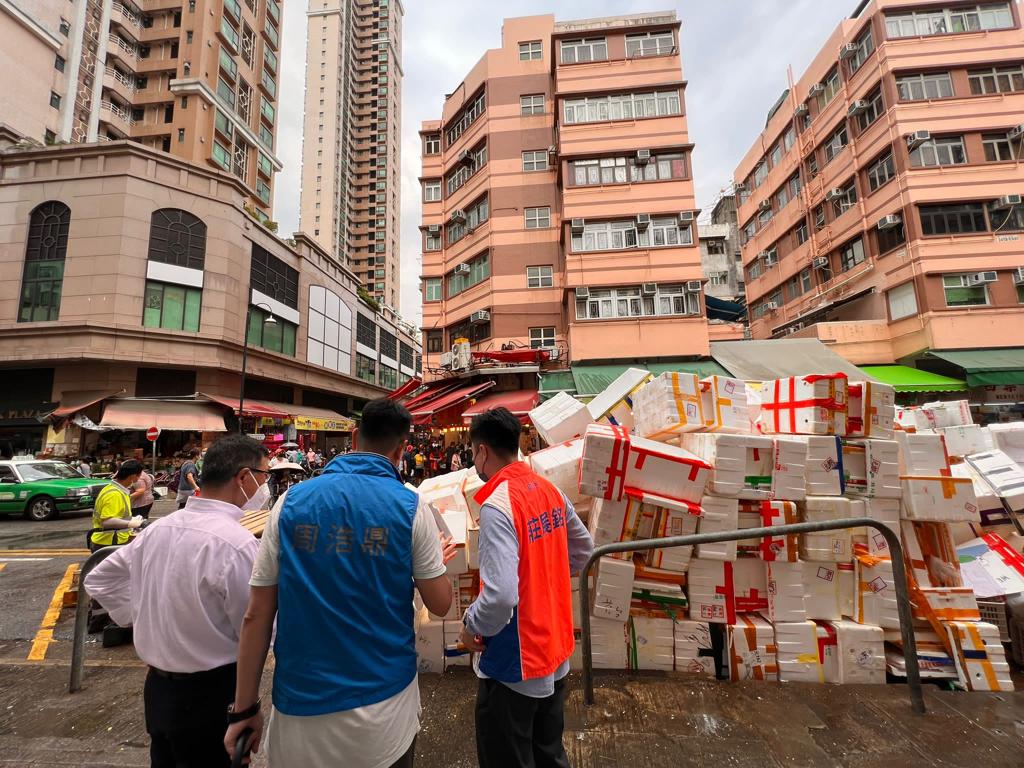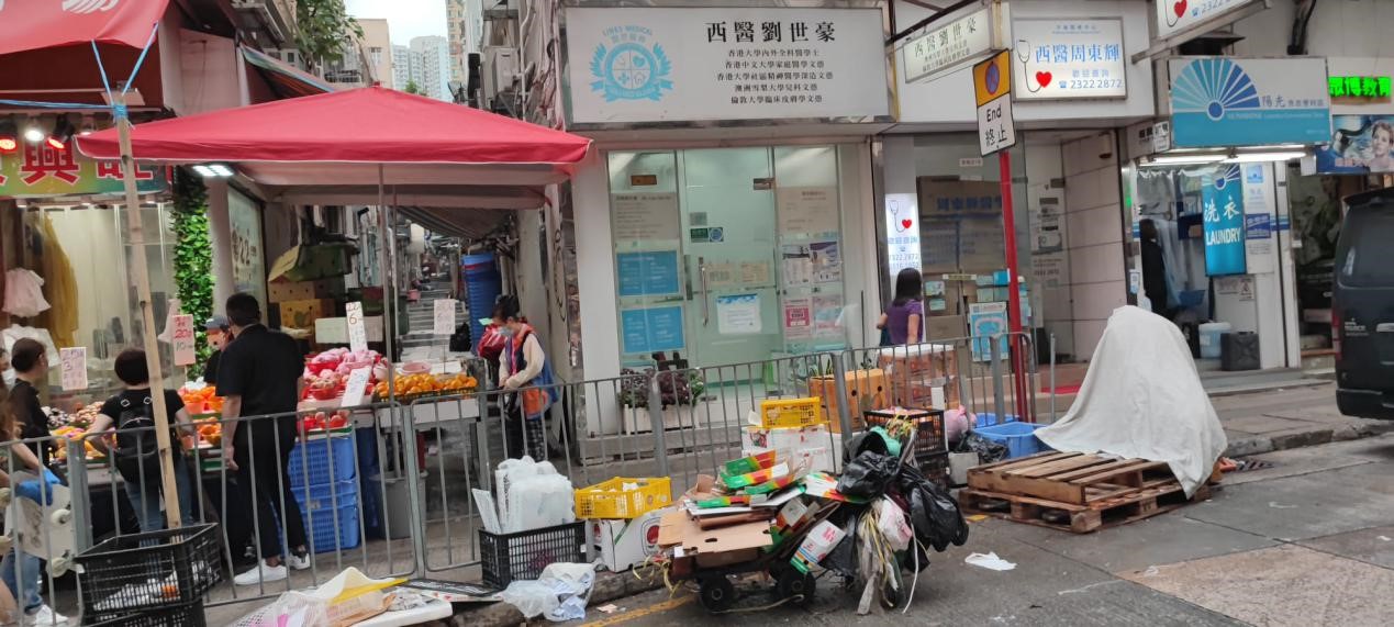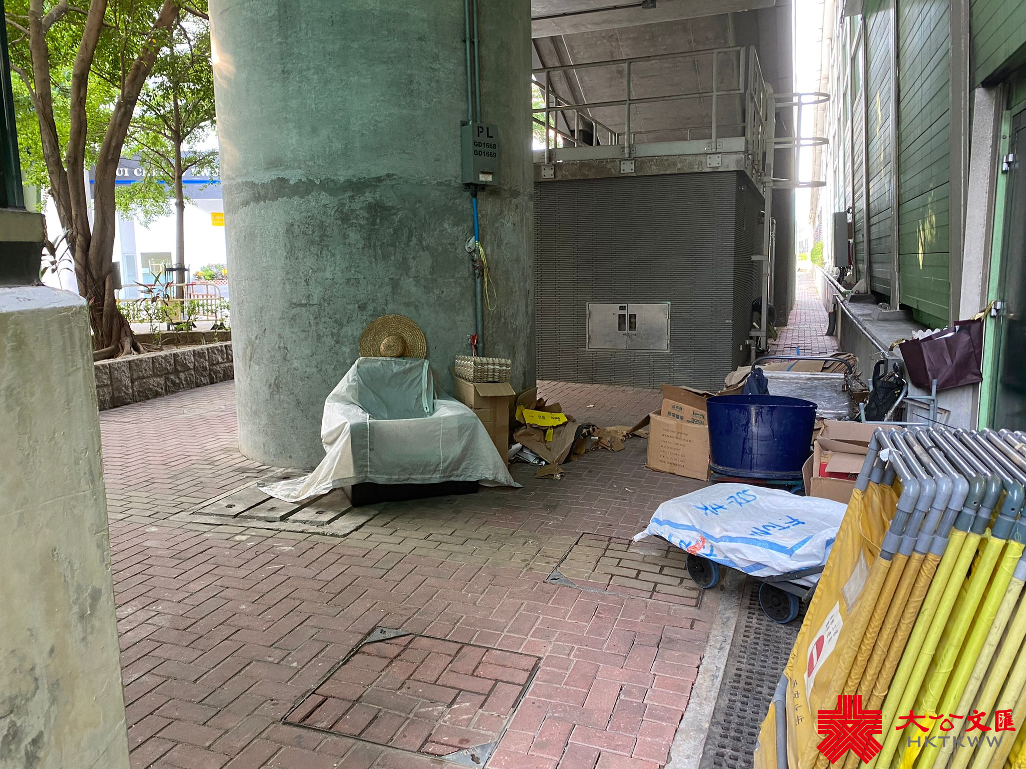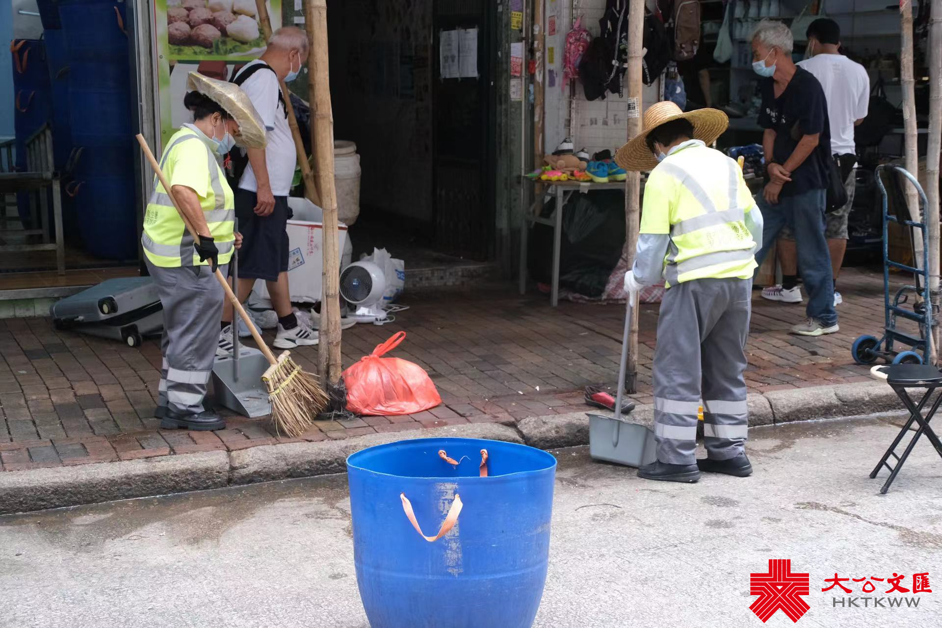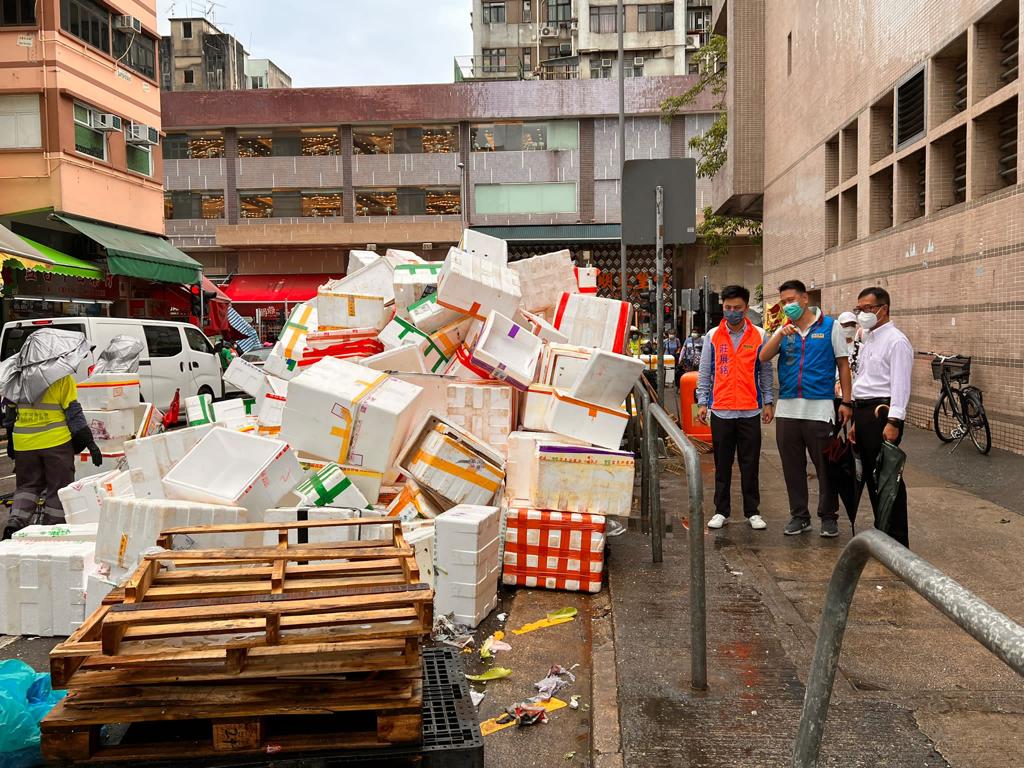 位於港島灣仔區威非路道5X巴士總站及銅鑼灣街市後巷處,只見有人用手推車將紙皮、發泡膠及帆布等雜物推往後巷存放,現場環境惡劣,衞生情況欠佳。在炎炎夏日底下,食環署清潔工只佩帶基本防疫裝備,努力清理附近的垃圾及污水,有工友更不耐炎熱天氣,暫時將口罩脫下,令人擔心感染疾病。