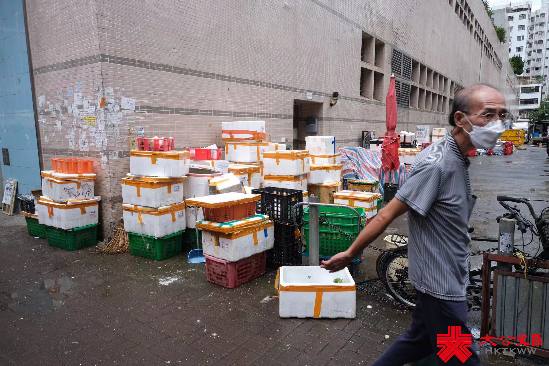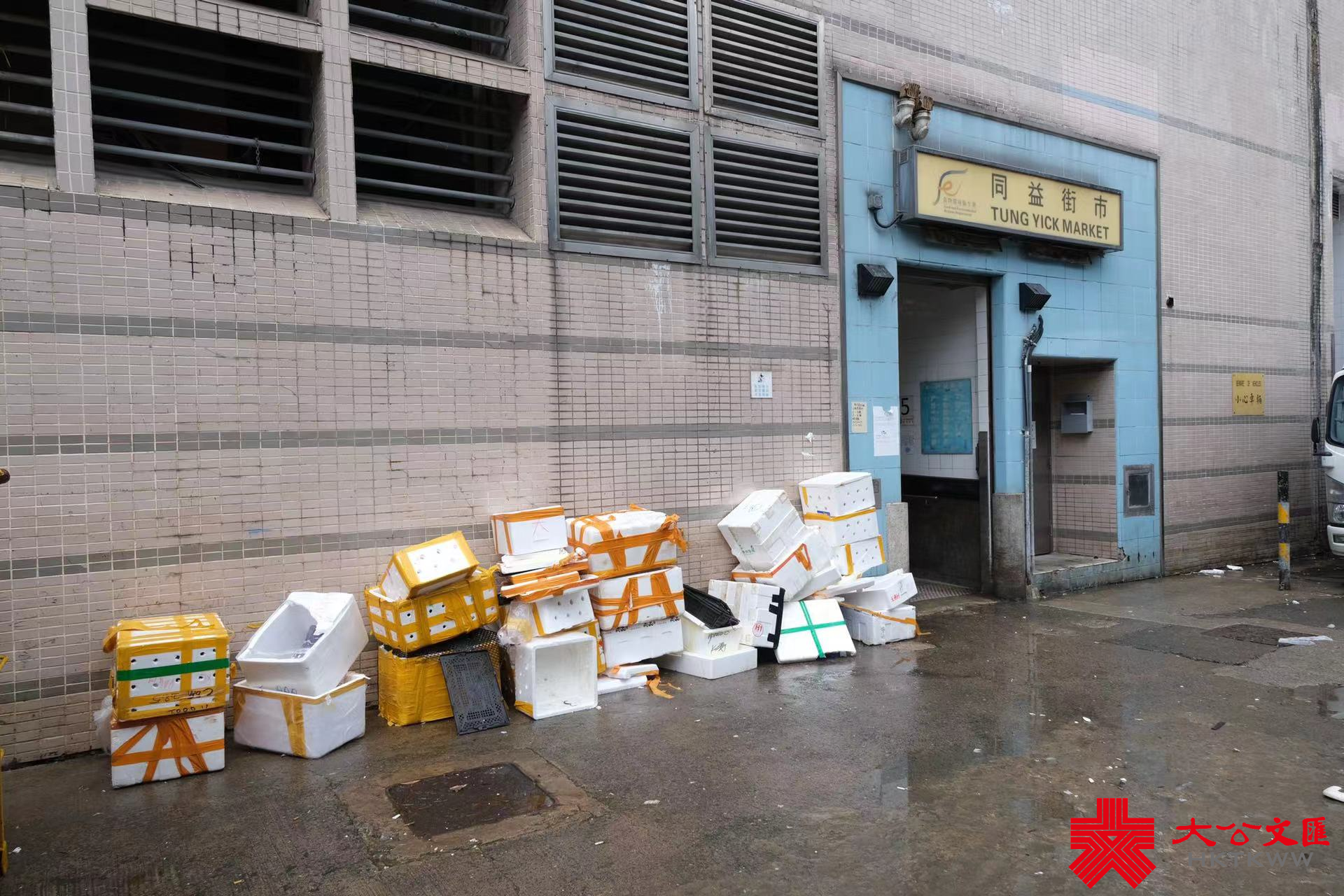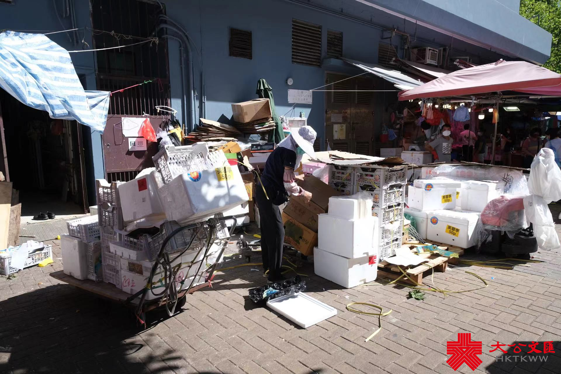 元朗新街和同益街市附近,有大量菜檔和水果檔的發泡膠箱隨意擺放在馬路旁,有的甚至霸佔半條行人路,下雨過後,容易積存雨水,滋生蚊蟲;黃大仙鳳凰新村一帶,也能見到大量發泡膠箱堆積在路旁,垃圾回收站前更有「發泡膠山」,有少量工作人員正在處理;在黃大仙中心,記者見到部分工作人員正在處理發泡膠箱上殘存的膠紙,身旁則有逾2米高的「發泡膠墻」等待他們處理。
