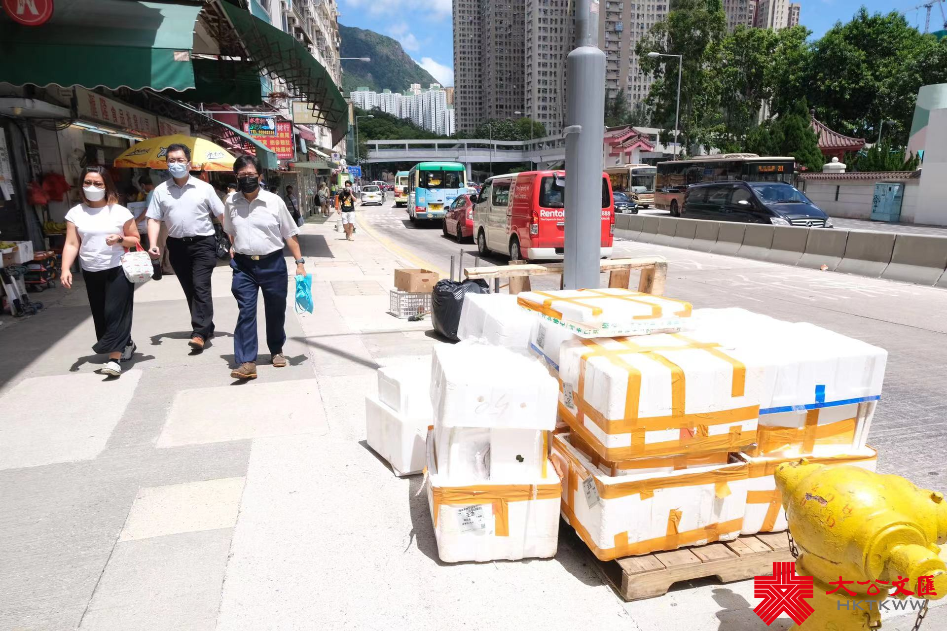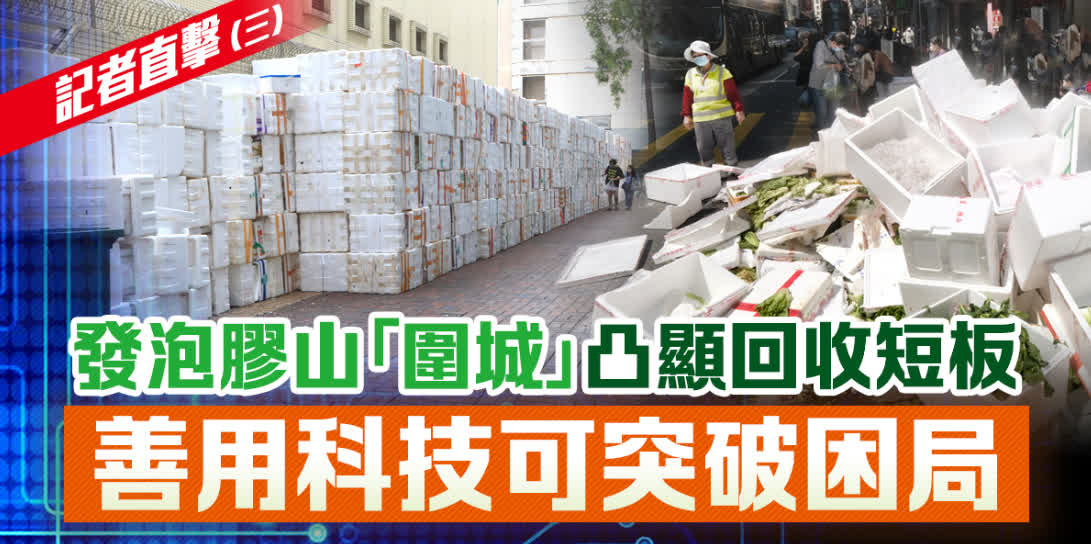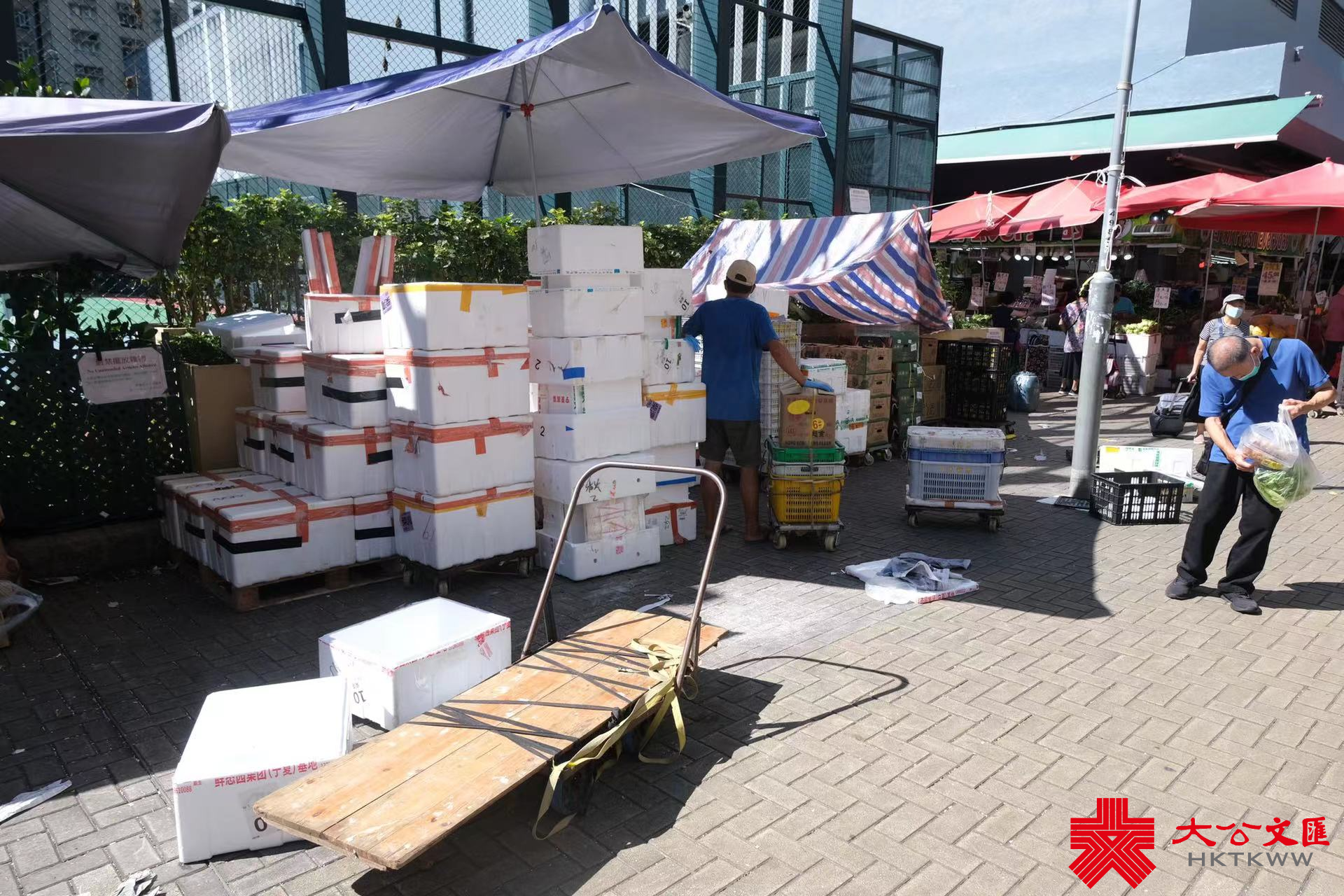 元朗新街和同益街市附近,有大量菜檔和水果檔的發泡膠箱隨意擺放在馬路旁,有的甚至霸佔半條行人路,下雨過後,容易積存雨水,滋生蚊蟲;黃大仙鳳凰新村一帶,也能見到大量發泡膠箱堆積在路旁,垃圾回收站前更有「發泡膠山」,有少量工作人員正在處理;在黃大仙中心,記者見到部分工作人員正在處理發泡膠箱上殘存的膠紙,身旁則有逾2米高的「發泡膠墻」等待他們處理。