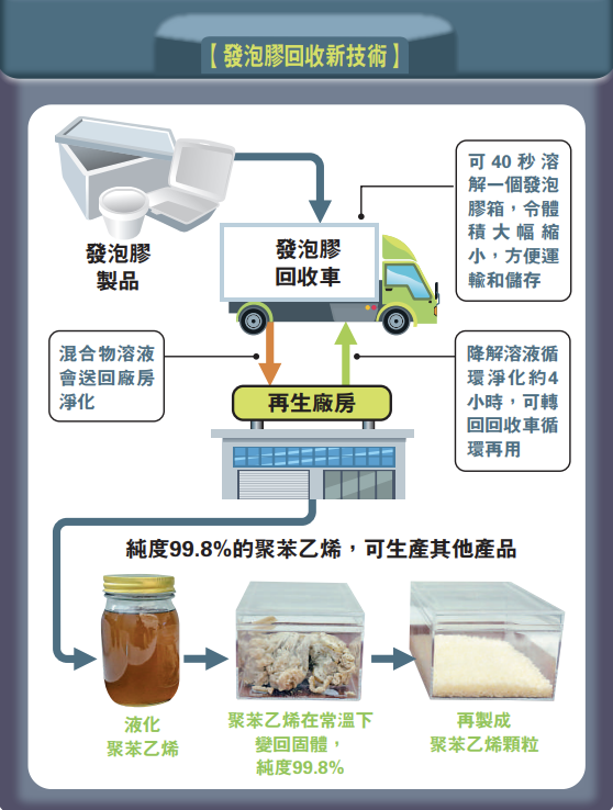 睿智環保科技向大公文匯全媒體表示,用了十年時間,研發出專門處理發泡膠(泡沫聚苯乙烯/ EPS)廢物的回收新技術,以回收車作為「流動回收工場」,最快40秒可以即場將發泡膠快速溶解成液體,之後在工廠經過濾及淨化,分離出純度高達99.8%的聚苯乙烯,用作生產其他產品,平均每日每車能處理250-300公斤發泡膠。不過該公司也表示,曾經與政府部門以試點形式完成合作接近4個月,之後未收到政府的意見,質疑政府是否真正重視創新科技的應用,認為政府應該大力推動環保產業發展。