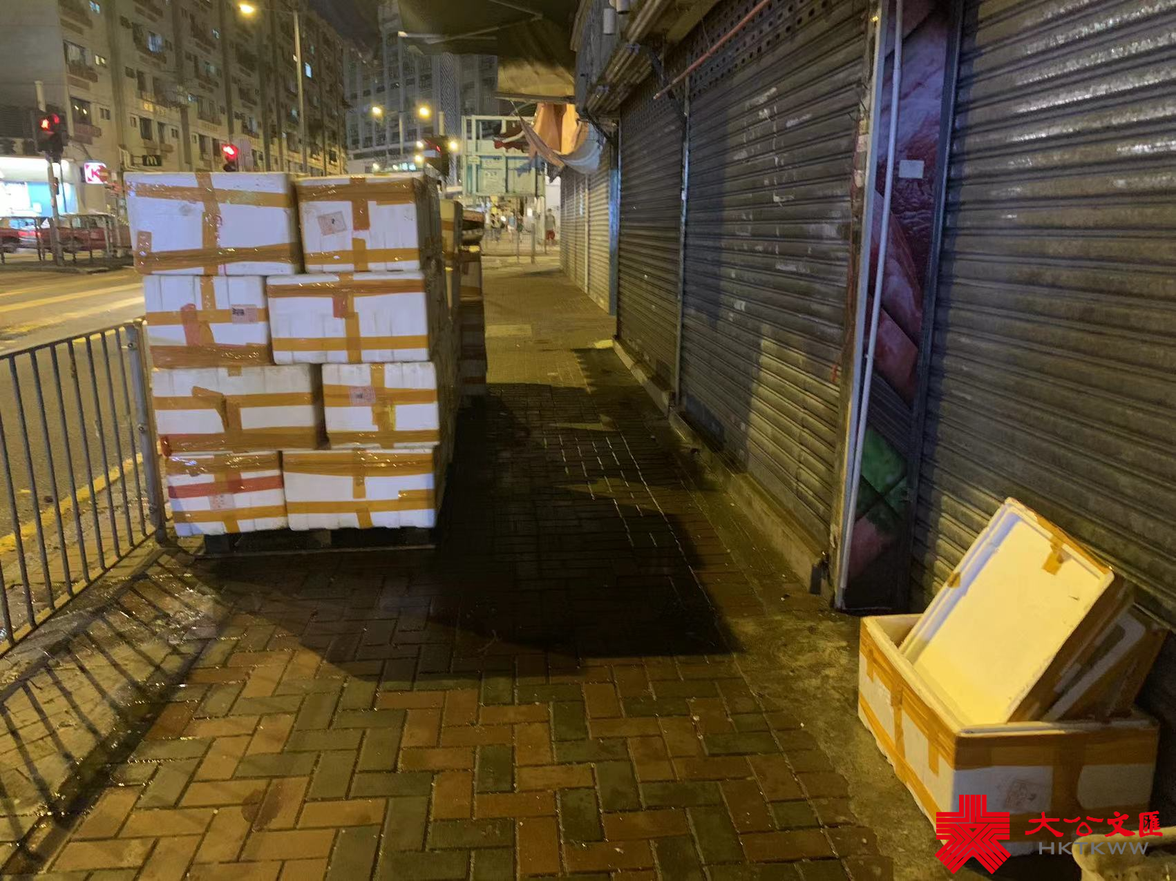 在港島的柴灣怡豐街,在嚴禁堆放雜物的標誌牌旁,堆放了大量發泡膠箱,成為商戶露天貨倉,以及工人清理回收的工作點,不斷有工人把一車車的膠箱送來堆疊或運走,混亂不堪;而在灣仔街市,部分商販將發泡膠箱棄置在路旁或後巷,散落一地蔬果碎屑,一方面影響市民購物,另一方面散發異味,造成衞生問題,加上雨天濕滑,途人稍不留意,就會被滑倒或絆倒,危機處處。