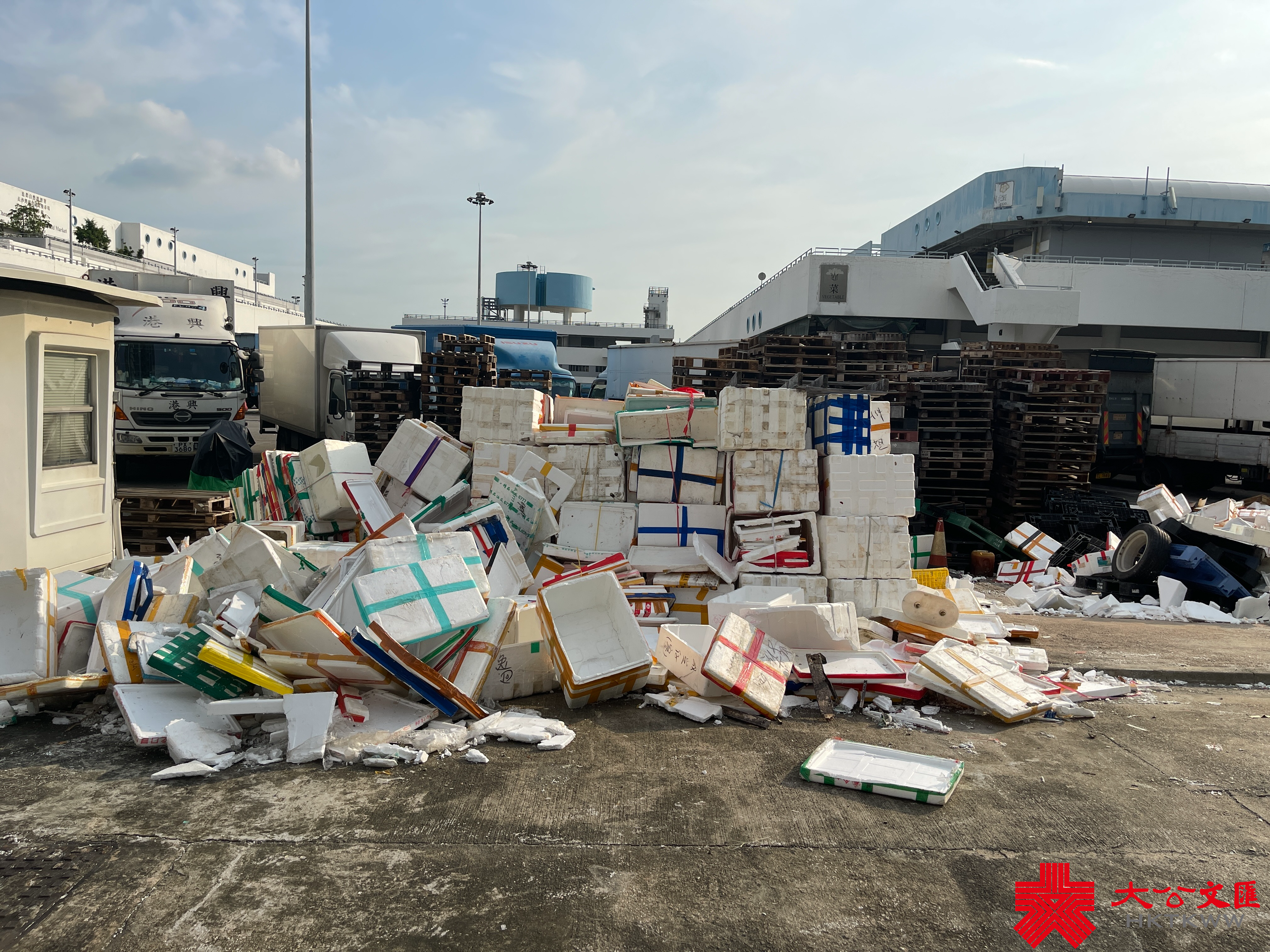 而在長沙灣副食品批發市場,從年初至今隨處可見大量「發泡膠山」,在烈日暴曬下,隨時有發生大火的風險。早在今年3月10日葵涌七號貨櫃碼頭有一批擺放在路邊的發泡膠箱起火,火勢猛烈,大量濃煙席捲半空,事件中無人受傷,調查相信有人不慎留下未熄煙蒂所致。