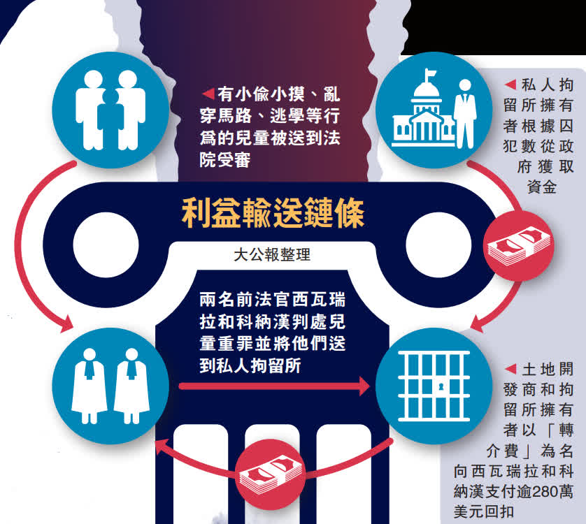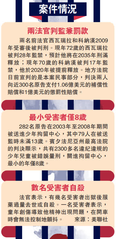 大公報綜合美聯社、《紐約時報》報道:美國賓夕法尼亞州兩名前法官濫用職權,將2300多名有小偷小摸、亂穿馬路、逃學等輕微違紀違規行為的未成年人送到營利性的私人拘留所,其中最小的年僅8歲,兩名法官藉此賺取280萬美元(約2184萬港元)回扣。聯邦地區法院16日判處兩被告向282名受害者賠償2.06億美元(約16.07億港元),兩人2011年已被判監禁。