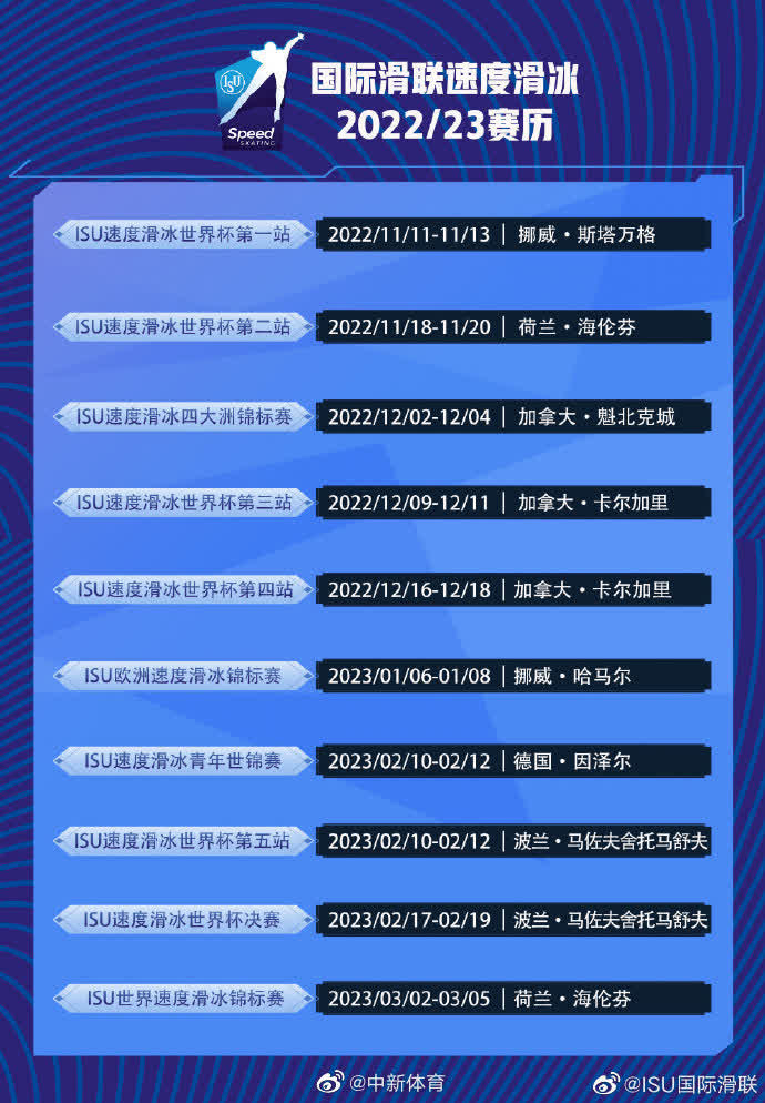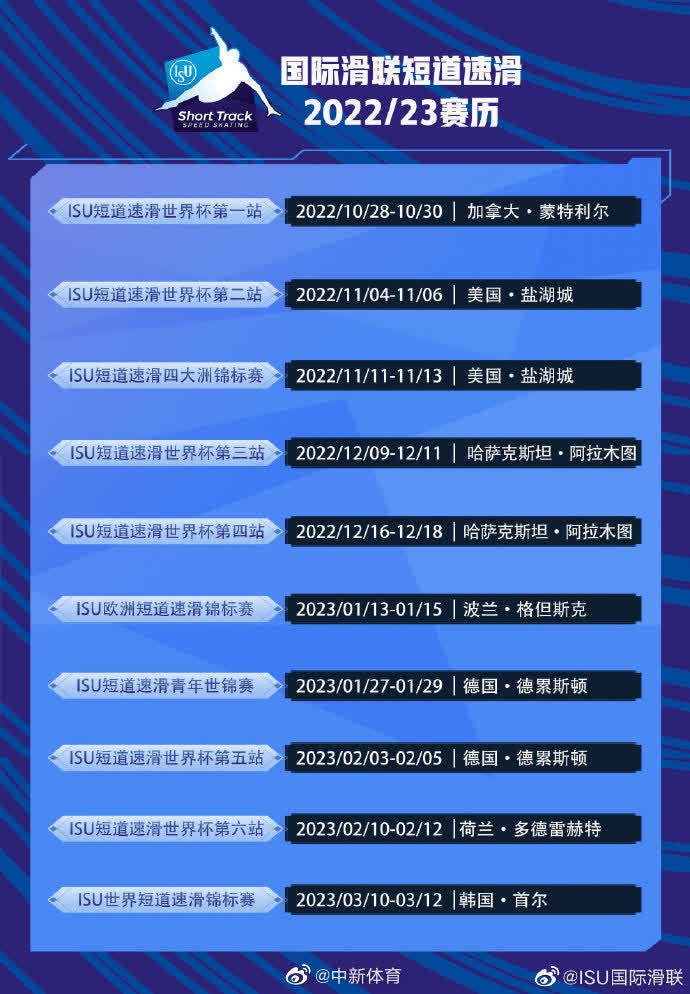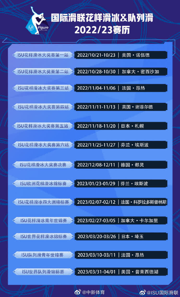 據中新網報道,ISU國際滑聯日前公布了2022-23賽季花樣滑冰及隊列滑、短道速滑、速度滑冰的比賽賽歷。花樣滑冰大獎賽第一站將在10月21日在美國諾伍德進行,短道速滑世界盃第一站將在10月28日在加拿大蒙特利爾進行,速度滑冰世界盃第一站將在11月11日在挪威斯塔萬格進行。