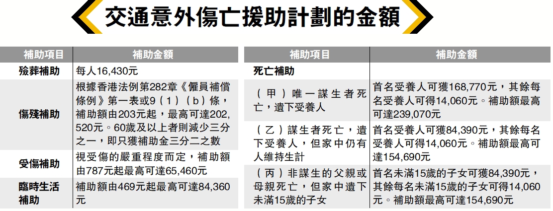 •如就同一宗意外獲得其他賠償,則須退還。所獲得的交通意外傷亡援助金或賠償,兩者中以金額較少者為準。