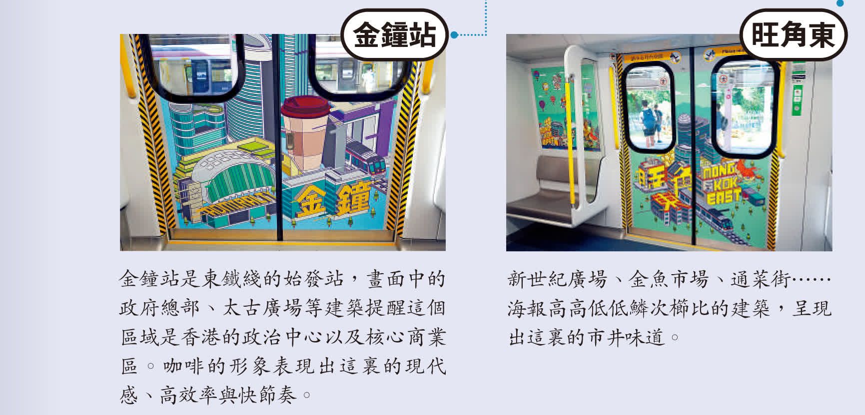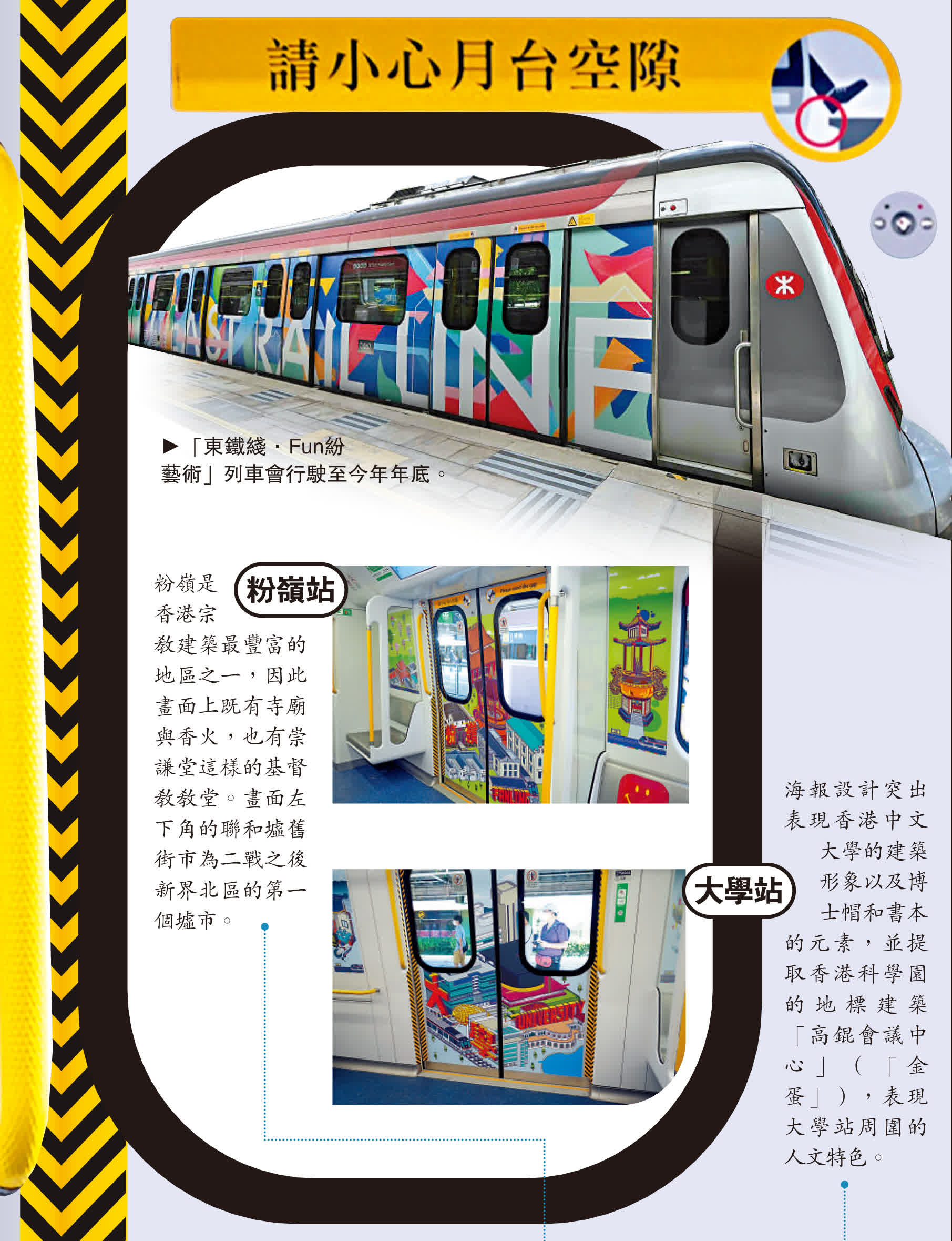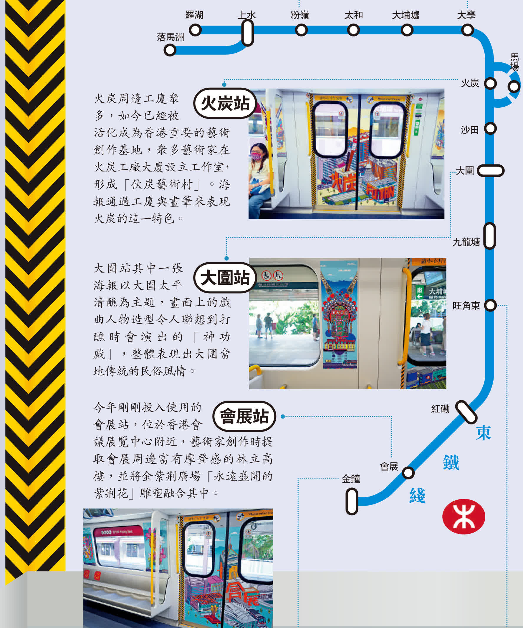 從北區的山野意趣自然風光,到油尖旺的市井味道,再到摩登現代的核心商業地帶金鐘,全長約四十六公里、共十六個車站的東鐵綫沿綫社區各具特色。為了令乘客在全程約五十分鐘的東鐵綫旅程中更好地感受香港的文化特色,本月起,一輛名為「東鐵綫·Fun紛藝術」的列車悄然啟程,港鐵公司通過與香港藝術家和沿綫學校的學生合作,將社區的獨特風貌帶進列車,乘客可以一邊欣賞藝術作品,一邊發掘及遊歷各社區的獨特風貌。