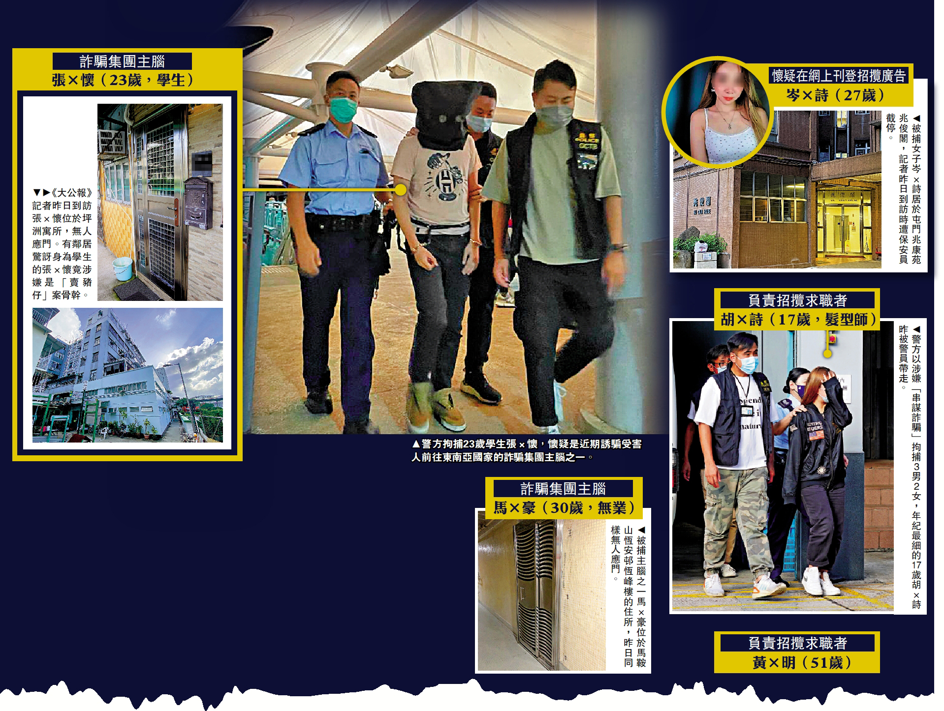 警方有組織罪案及三合會調查科(O記)經調查後,一連三日(19至21日)以涉嫌「串謀詐騙」罪拘捕3男2女,年齡介乎於17至51歲,相信為同一集團。其中兩名男子張×懷(23歲、報稱學生)和馬×豪(30歲、報稱無業)為集團骨幹成員,據了解,張某為一名大專學生,正修讀照顧病人的護理相關專業。警方指兩名主腦負責聯絡及操控另外兩名被捕男女黃×明(51歲)及報稱髮型師的胡×詩(17歲)以招攬受害人,餘下一名被捕女子岑×詩(27歲)則懷疑在網上刊登往東南亞工作的招攬廣告。所有被捕人仍被扣留調查當中,不排除稍後將落案起訴個別被捕人。