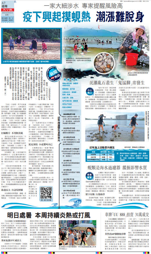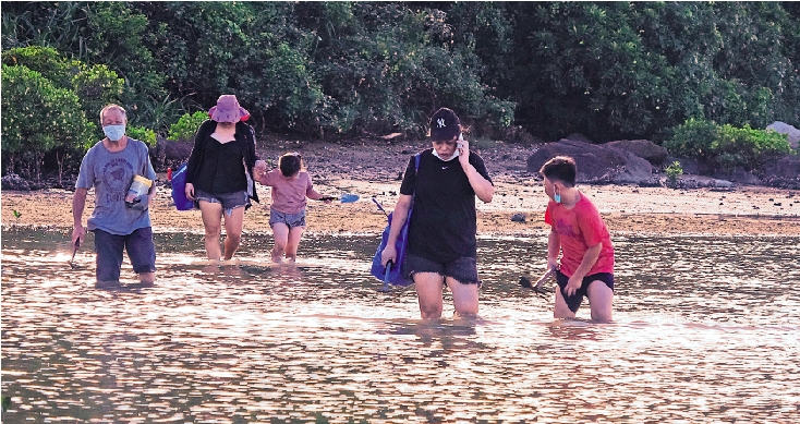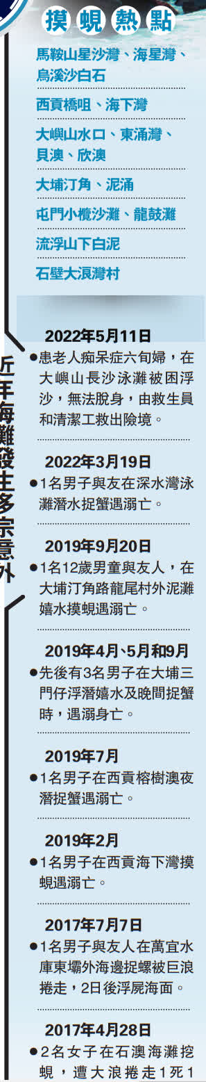 疫下外遊難,本港興起淘海產活動,摸蜆、捉蟹、浮潛等意外頻生。據警方數字,在過去兩年多已造成39人死亡。數字觸目驚心,不過,不少市民為了口福和玩樂而繼續冒險,當中不少是親子遊的初哥。記者上周日在曾發生致命意外的東涌灣,發現不但有幼童泥足深陷,有家長更無視漲潮危險,帶着幼童涉水,甚至在泥灘四處找尋獵物,情況堪憂。
