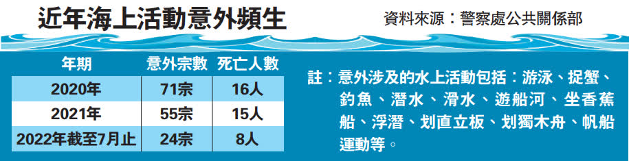 香港政府拯溺員總工會主席鄧子安表示,每逢秋夏季節,很多市民都喜歡從事各類水上活動,例如晚間海灘浮潛、捉蟹、摸蜆等,「切莫獨自行動,否則萬一發生意外都冇人知。」鄧強調,這類的晚間水上活動,一定要帶齊防割傷手套、防護衣、照明用大電筒等裝備,以及充足的飲用水及補充體能的乾糧。