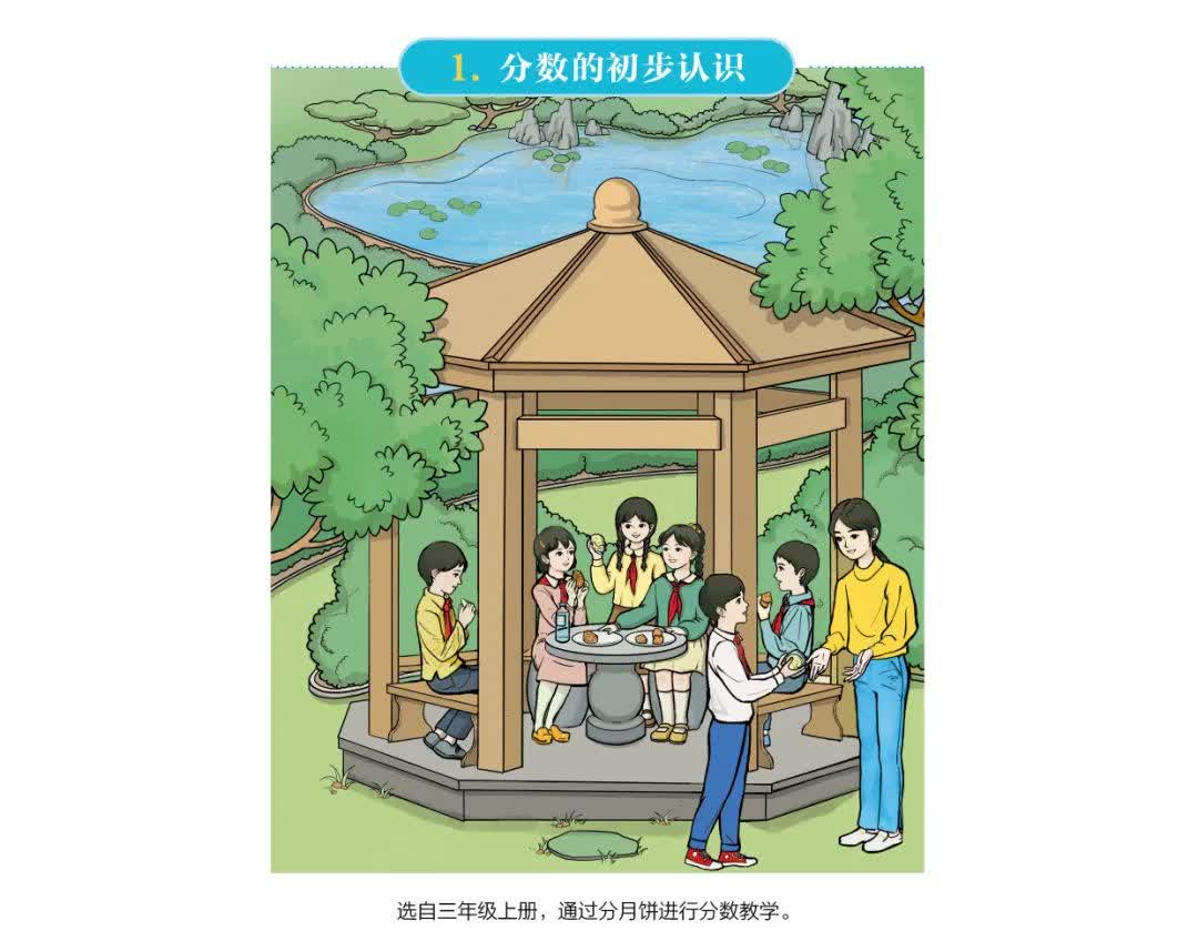新繪製的小學數學教材插圖在整體上力求體現出「中國風」「時代感」「精氣神」和「數學味」的風格特點,展現新時代中國少年兒童陽光、向上、愉悅的精神面貌,堅持大眾主流審美取向,遵循兒童認知與身心發展規律,清新雅正,簡潔大方,圖文相融。