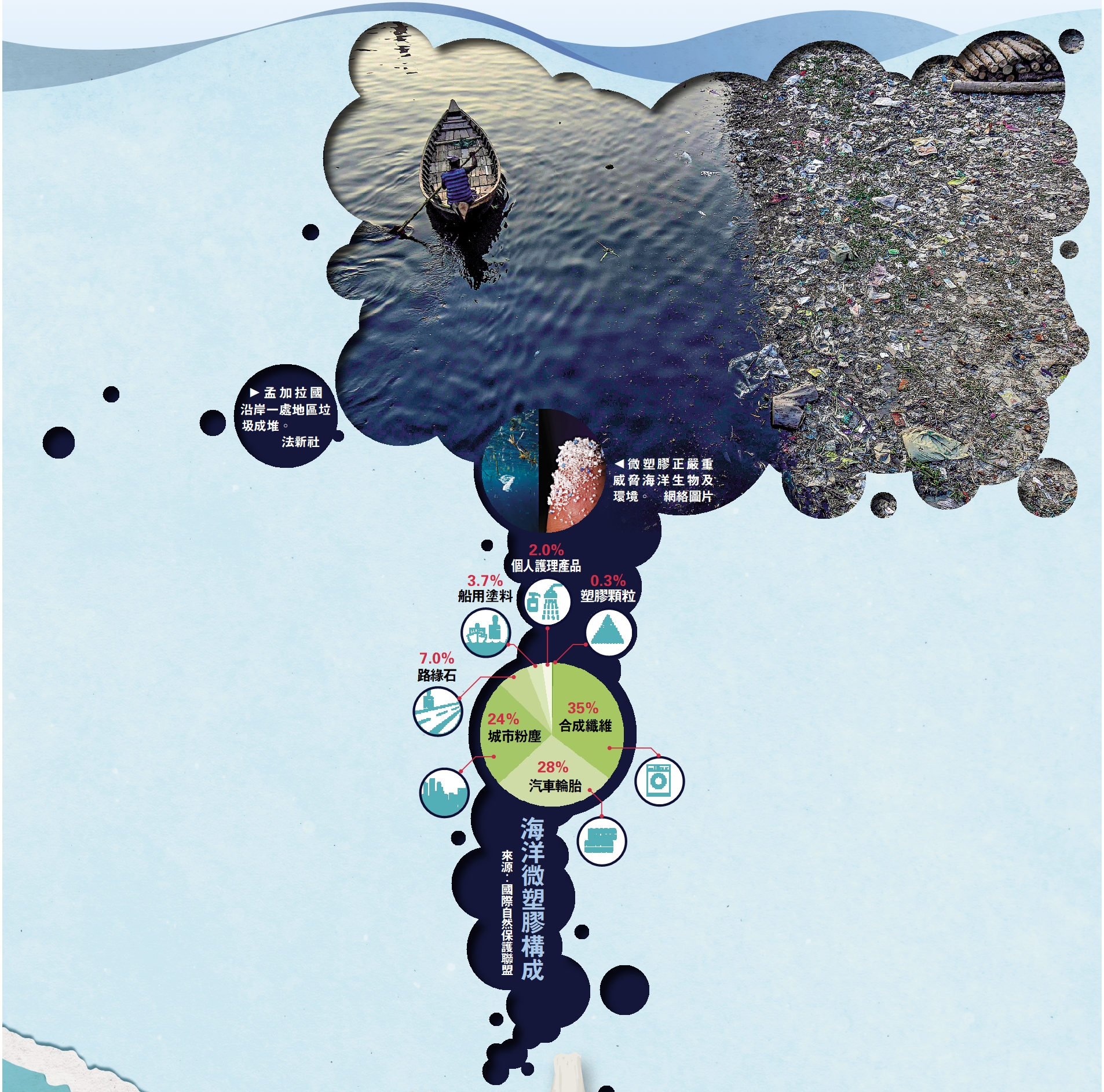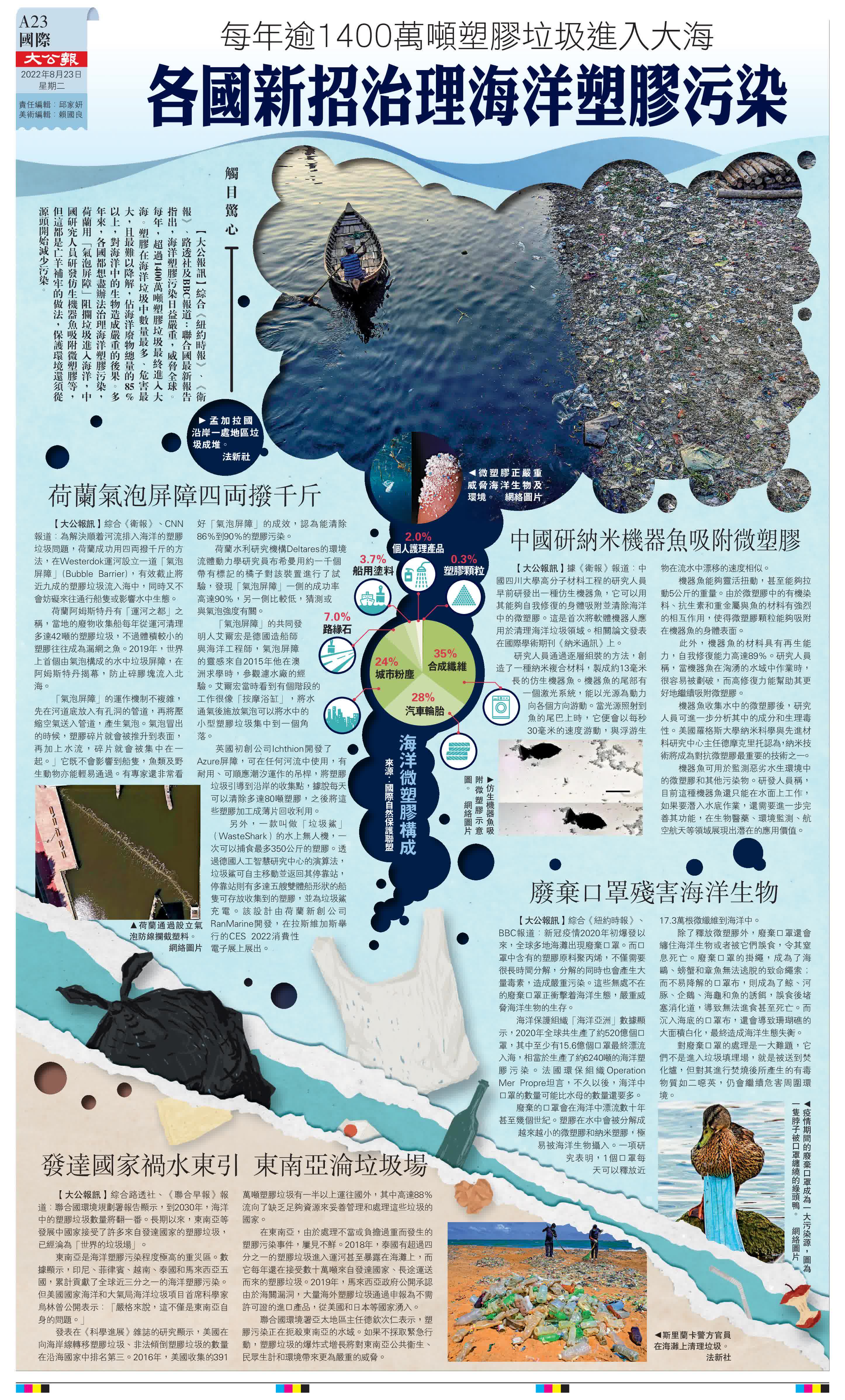 大公報綜合《紐約時報》、《衛報》、路透社、聯合早報、CNN及BBC報道:聯合國最新報告指出,海洋塑膠污染日益嚴重,威脅全球。每年,超過1400萬噸塑膠垃圾最終進入大海。塑膠在海洋垃圾中數量最多、危害最大,且最難以降解,佔海洋廢物總量的85%以上,對海洋中的生物造成嚴重的後果。多年來,各國都想盡辦法治理海洋塑膠污染,荷蘭用「氣泡屏障」阻攔垃圾進入海洋,中國研究人員研發仿生機器魚吸附微塑膠等,但這都是亡羊補牢的做法,保護環境還須從源頭開始減少污染。