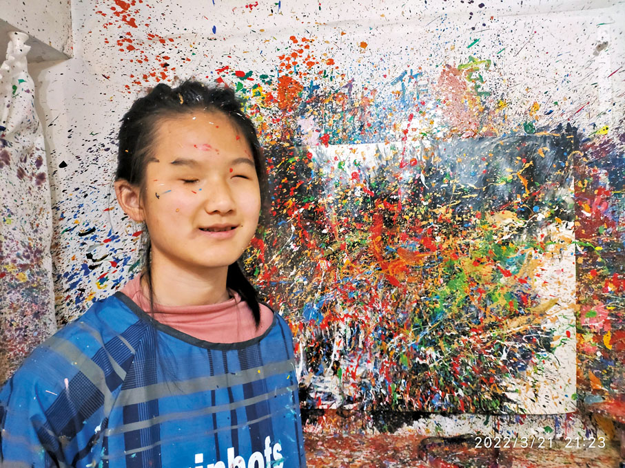(香港文匯報記者 王玨)八月晚夏,一場名為《心目·黑暗中的綻放》的特殊畫展在北京著名的798藝術中心進行,這是內地首個視障青少年個人畫展,作畫之人是15歲的花季少女劉馨茗。身為從未感受過光明的盲女孩,出生三天便被判定為終生眼盲,但她借助於藝術的渠道表現所觸所感、所思所想,抒發喜怒哀樂,用豐富敏感的內心描繪出一個個浪漫唯美的五彩世界,參觀者無不被小畫家自強不息的精神和作品的藝術表現力所感染。